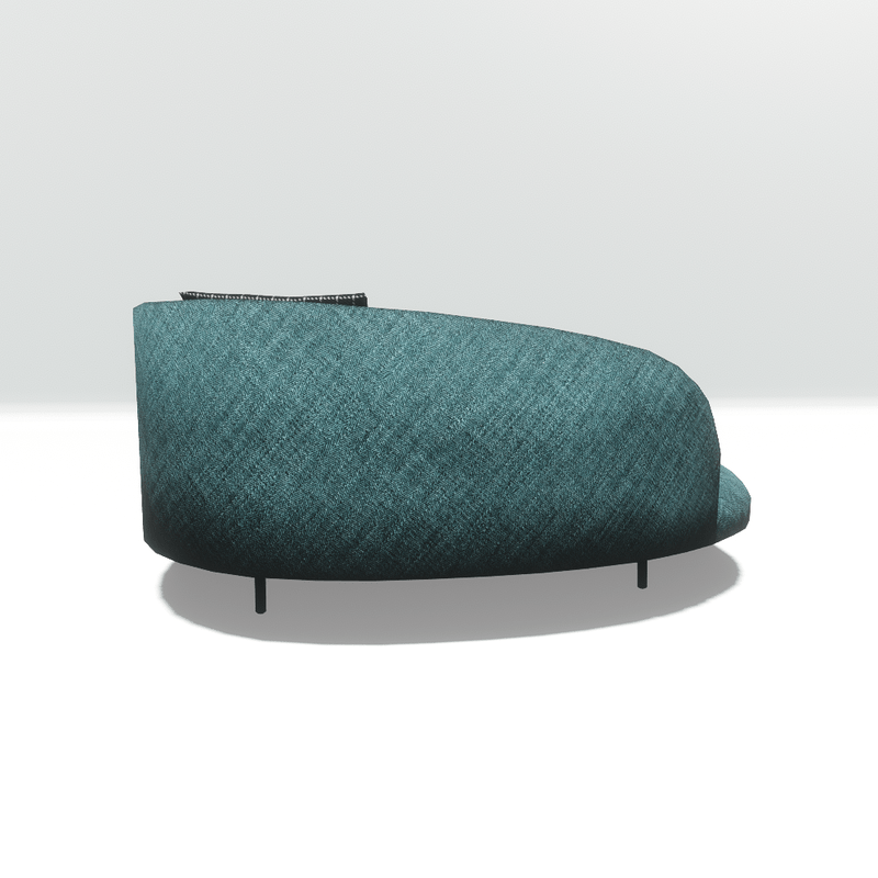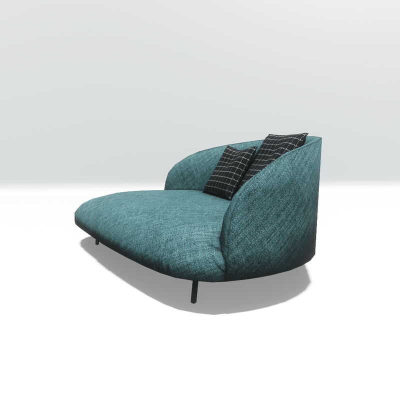 Two-seater sofa with blue fabric and 2 cushions, in a modern, asymmetrical design. It is editable and has collisions.