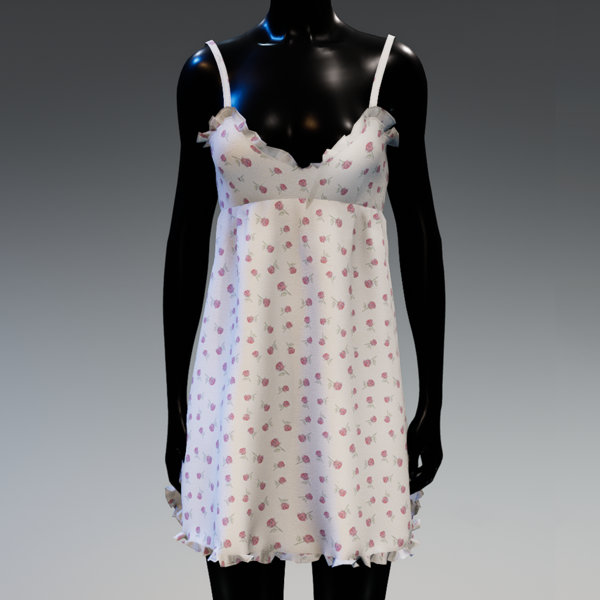 A cute, short nightwear with straps, ruffles and small printed roses.