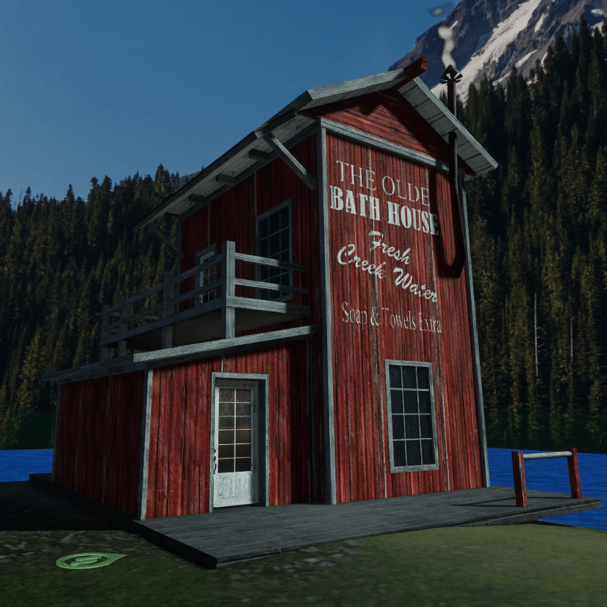 Old west style bath house with scripted doors and chimney smoke; adjust if needed... includes built in ambience lights, adjust if needed.. use Scene Object browser to move, scale or disasemble. the sign can be edited in material editor to add your own or make transparent to remove..