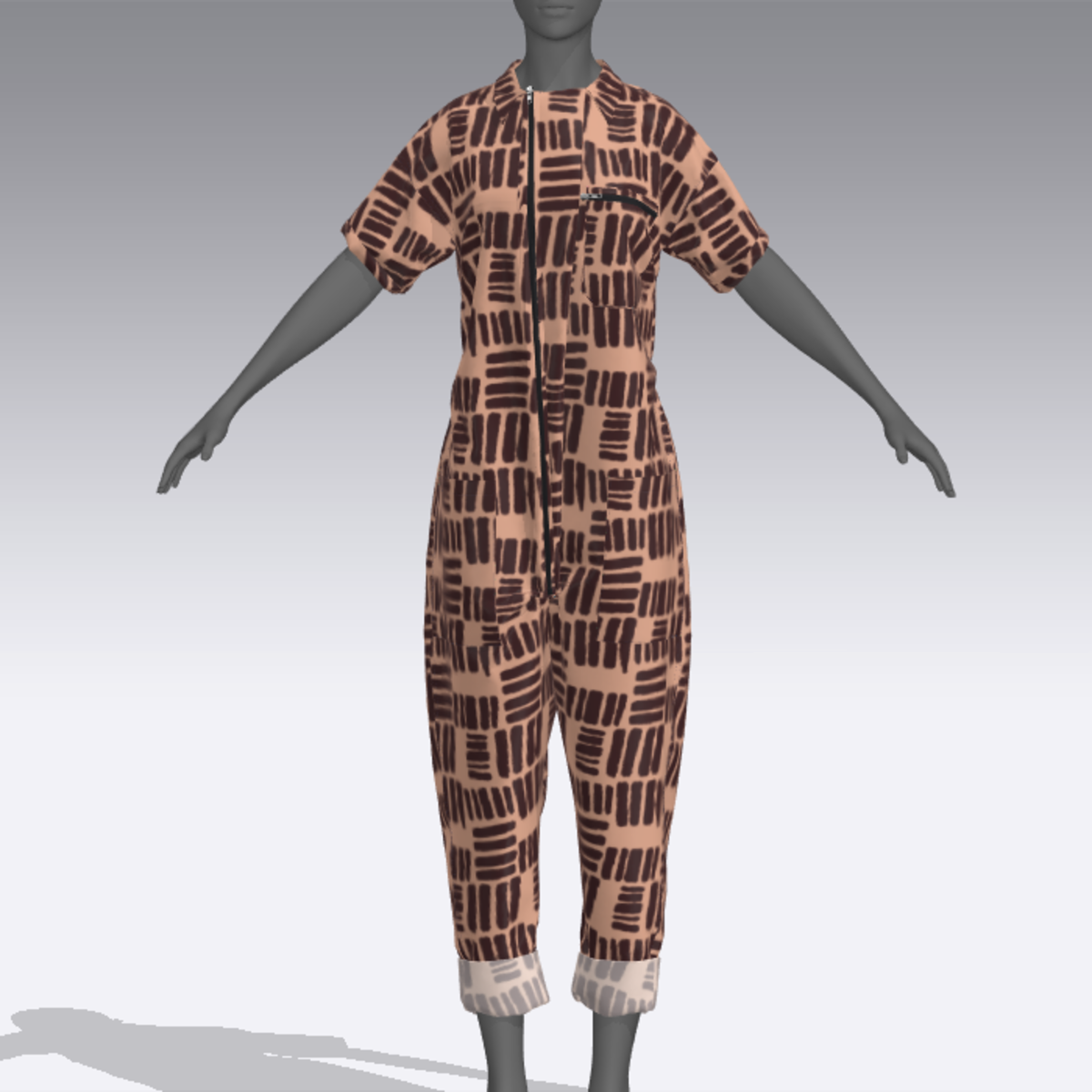 Jumpsuit with working zip front placket. Chest pocket with zipper and 3 patch pockets 2 at sides and one on the back. Allover abstract print and rolled cuffs. Made to fit avatar 2.0.