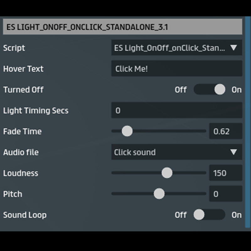 A very easy script that permits to turn on/off a light with a click. Perfect for desk lamps and more HOW TO USE: Place it in an object with at least a light component. Remember to set light components as SCRIPTABLE PARAMETERS TO SET: [HOVER TEXT]: Set hover text for interaction [TURNED OFF]: Decide if you want your light start off or on [LIGHT TIMING SET]: If > 0, light will turn off after seconds you set [FADE TIME]: A fading way to turn on or off your light [AUDIO FILE]: Add an optional audio file every time you click [LOUDNESS]: Loudness of audio file [PITCH]: Pitch of audio file [SOUND LOOP]: If true, audio will looped. You will stop clicking again. I used it in my experience here: https://atlas.sansar.com/experiences/sergiodelacruz/orphanage-of-angels [FIND MY OTHER SCRIPT SEARCHING BY TAG "easyscript"] ★ If you like this item, please support me giving a rate! www.sergiodelacruz.net