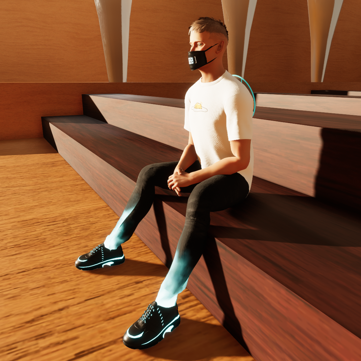 Medium level chair sit leaning forward. Emote for default male avatar. -Note that the position of the clavicles in a female avatar is slightly different so the hands will be off about an inch.