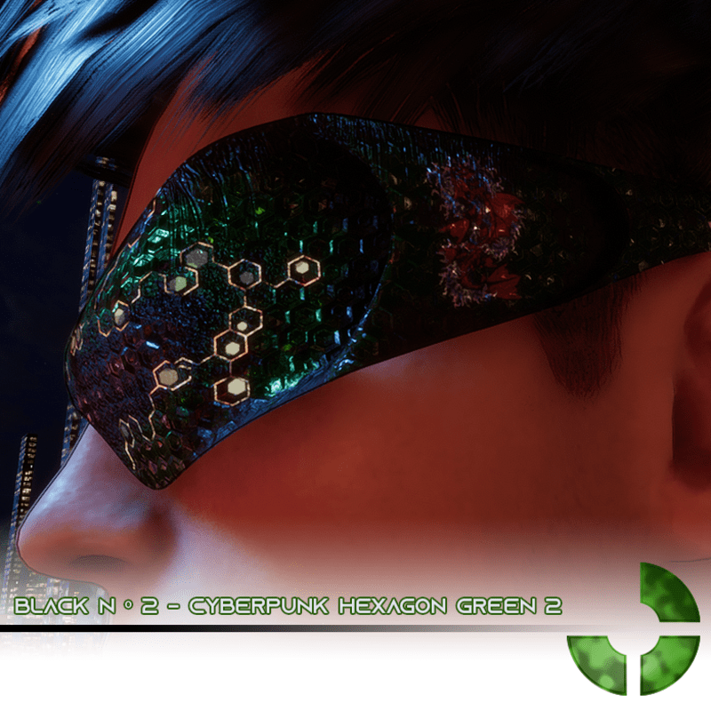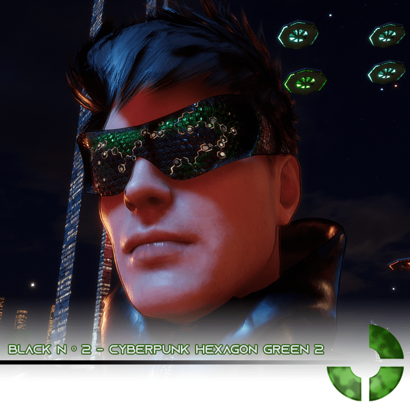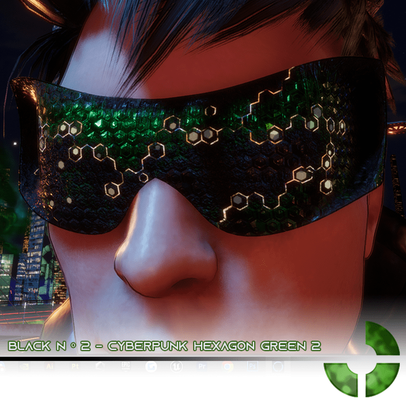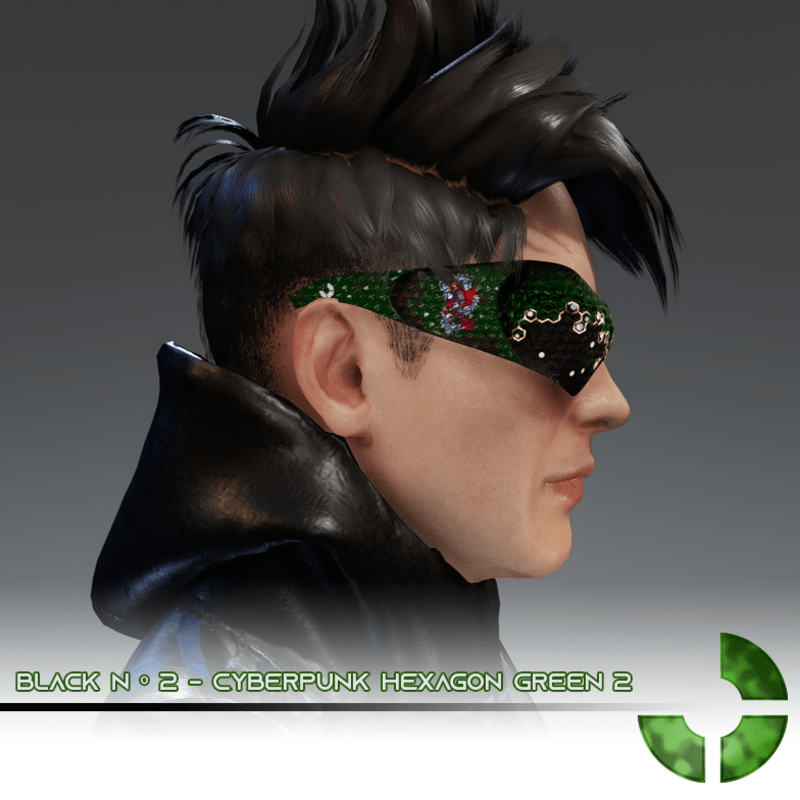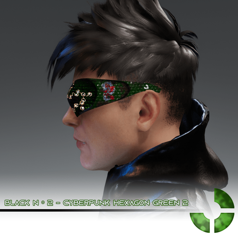 A Cyberpunk Second Version of a Classic Black Nº2. With Emissive Leds- Green Hexagon Metal Texture Male Version- Female can wear with adjustments A Sun Glass with PBR texture specially made for Sansar Metaverse. Match with almost humanoids avatars in Sansar. Just a few adjustments to fit.