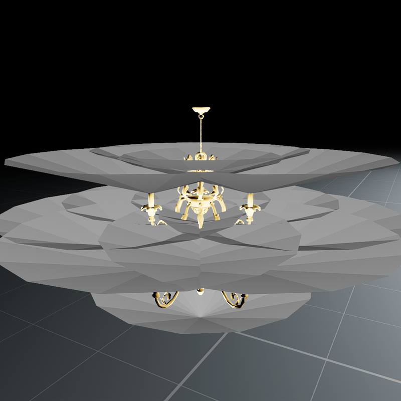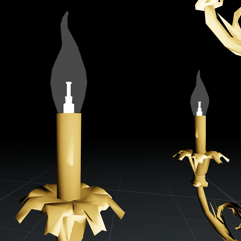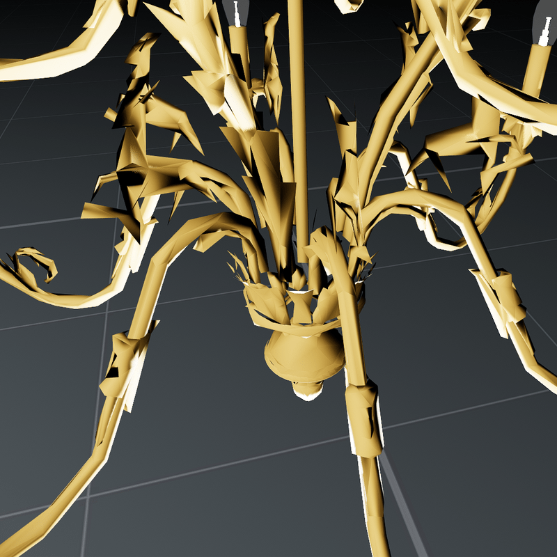 An ornate golden Chandelier, embellished with swirls, leaves and frolicking deer. Features 9 transparent glass bulbs, with an emissive filament so it lights up in the dark. I also added 9 separate lights in the exact position of each element so they each have their own real light glow. At the base of the chandelier is a single uplight to illuminate the frame slightly.