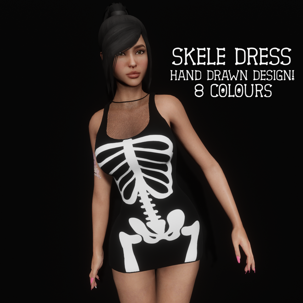 Get your spooky on with this skeleton dress! Perfect for Halloween! High quality textures, hand drawn too! Has beautiful normal map on it as well.