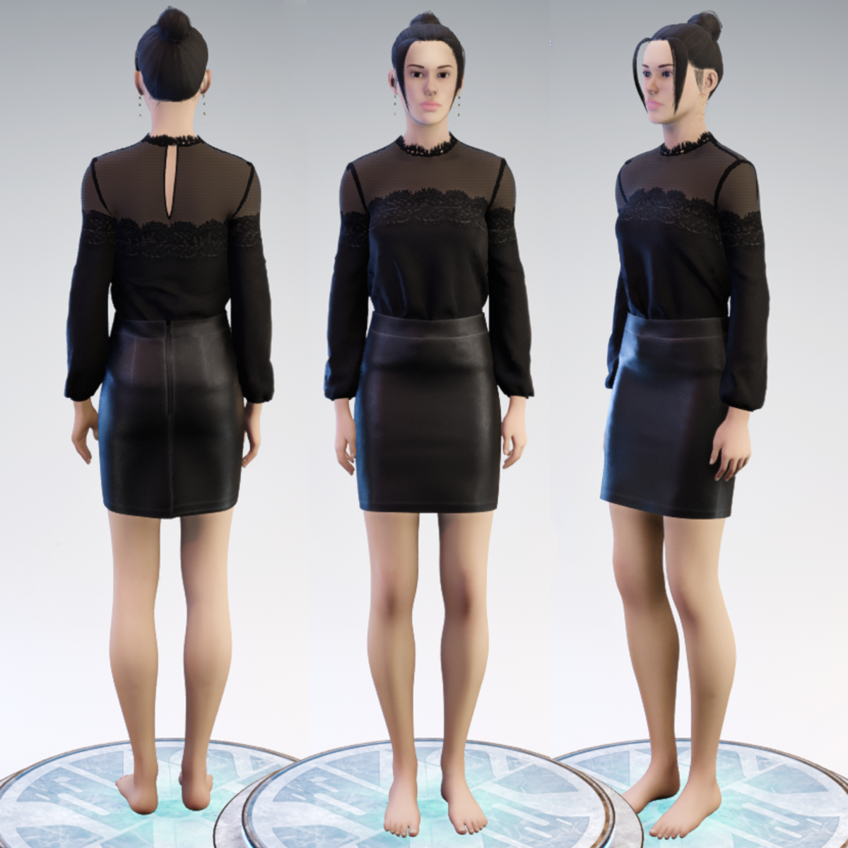 A black colour set that includes a leather skirt and a long sleeve blouse with lacy details.