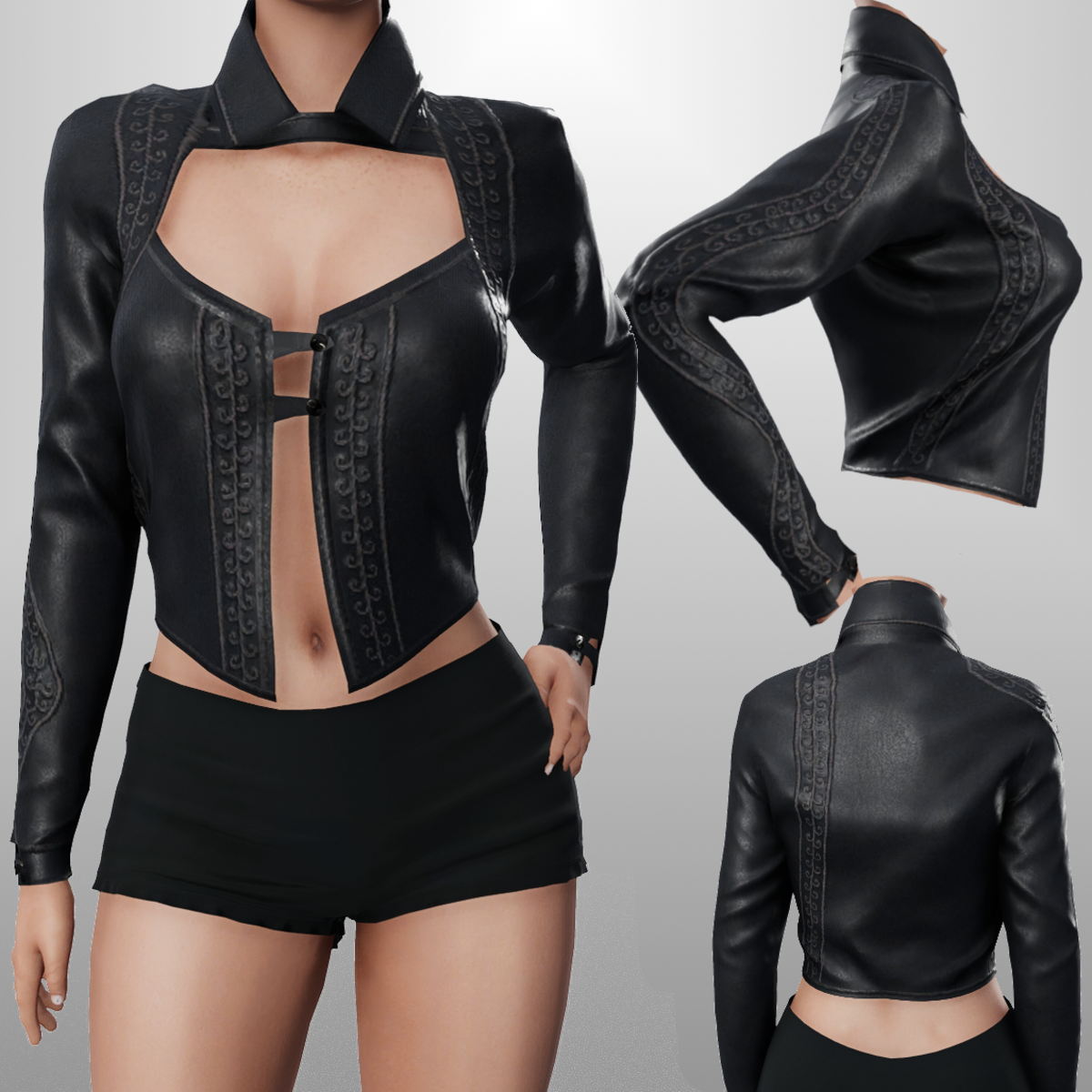Embossed Leather Jacket. Buttons closures are decoration and can't be unbuttoned. This jacket has beautiful embossed trim along the front, back and down one sleeve. Check my store for a animated emissive version and a regular emissive version. Get Demo Here: https://store.sansar.com/listings/f8d14213-ad79-4a1d-9e1f-5ebe27cfc379/demo--leather-jacket Trying on the available Demo is the best way to assure your satisfaction with quality and fit. The lighting isn't the best in the lookbook and the shoulders seem to fit funny in the lookbook as well, so I recommend wearing the demo in world to see how it truly looks on you. Visit my inworld store experience to find discounted items that or not available on the marketplace. https://atlas.sansar.com/experiences/lonaleelancaster/lona Made in Marvelous Designer and can be adjusted to fit most avatars. Please try a demo to assure fit and satisfaction. To learn more about transforming and adjusting Marvelous Designer clothing visit this link: https://help.sansar.com/hc/en-us/articles/115005693363-Fitting-Marvelous-Designer-clothing-to-your-avatar#some-tips