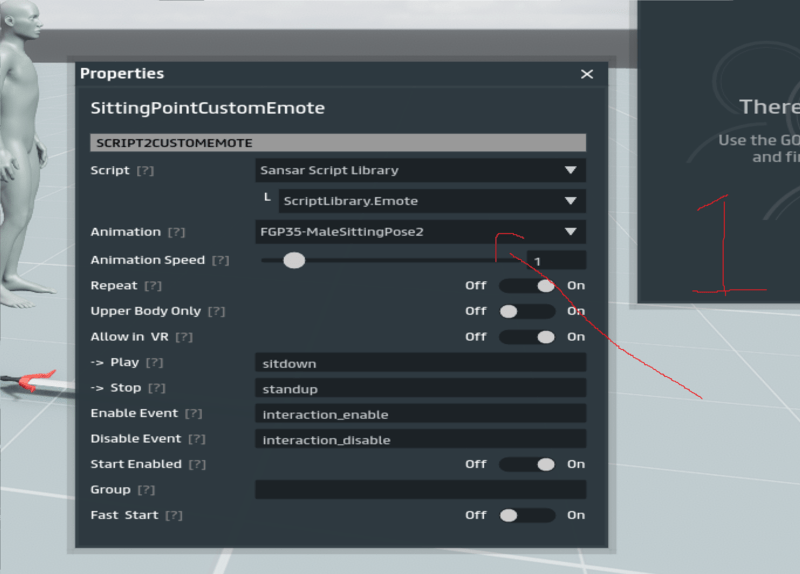 How To Set Up 1- Pick A Emote Inside The Emote Script 2- Place Box Where You Want Avatar To Sit 3- Select Material And Switch To Alpha Map will make box invisible Adjust Sit Position If Emote Is Not In Correct Place By Moving The Sit Pose Reference Grey Person