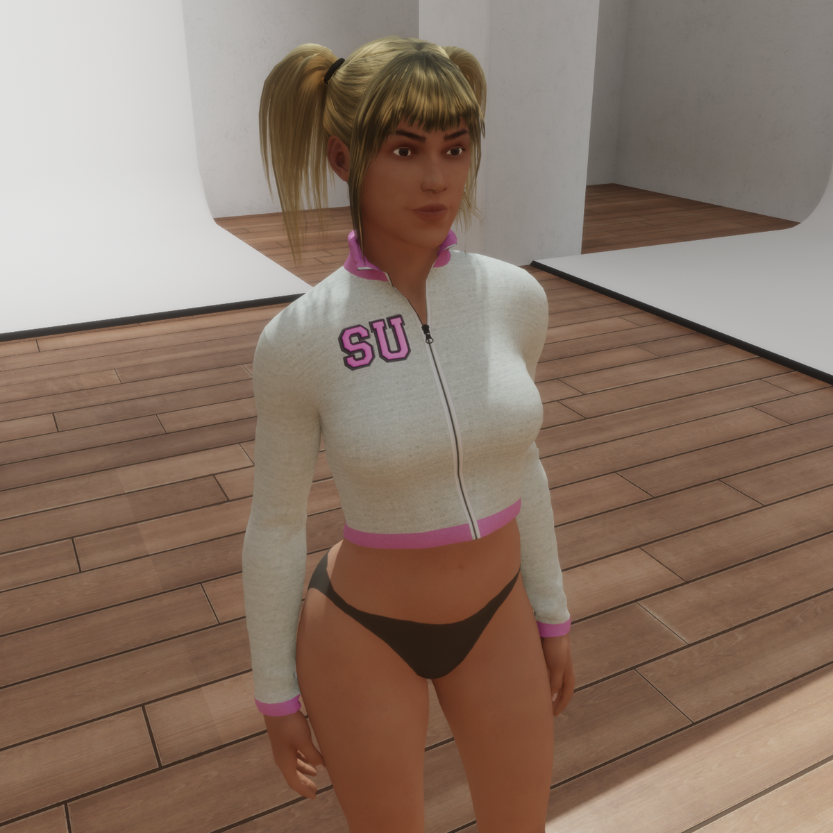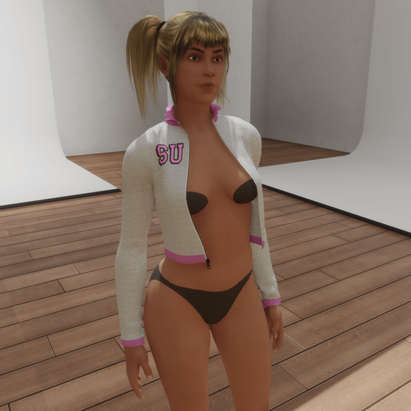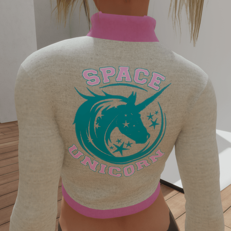 Cheerleader's long sleeve crop top with working zip. Adjustable. 'Space Unicorn' motif on back, 'SU' varsity letters on front. White with pink piping. Designed to match my other Cheerleader clothing.
