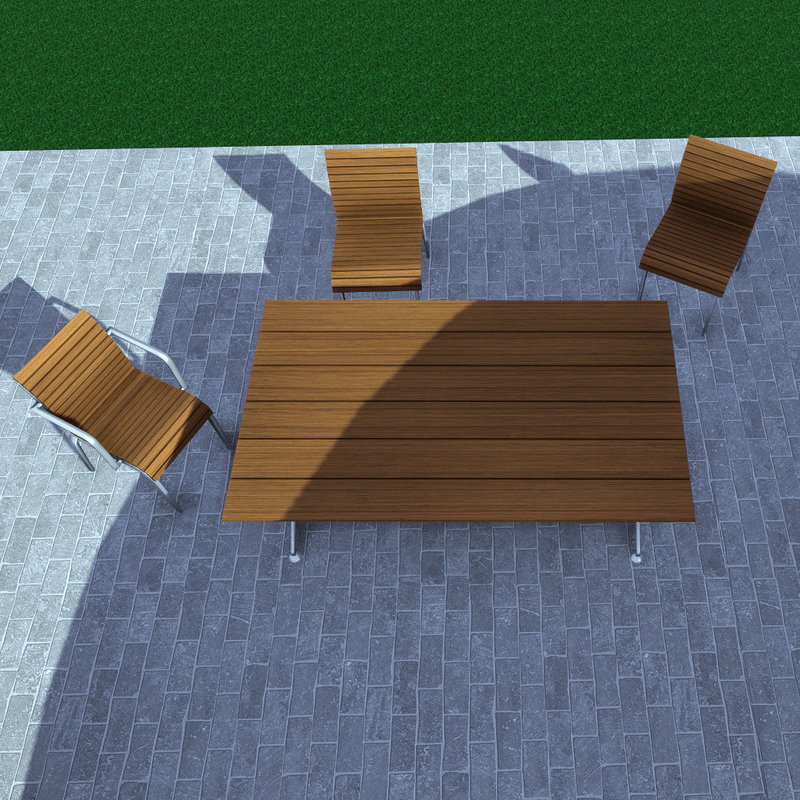 A wooden and metal table for the garden, patio, deck, pool, porch, backyard and all exterior house areas. The rectangular table has collision and its editable. Take a closer look here: https://atlas.sansar.com/experiences/luise/studio-lamda