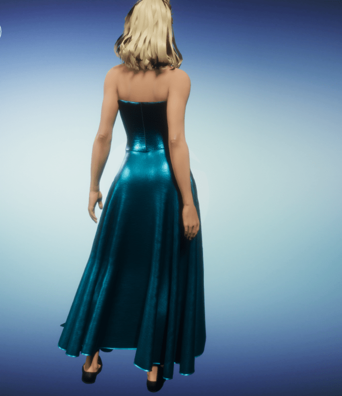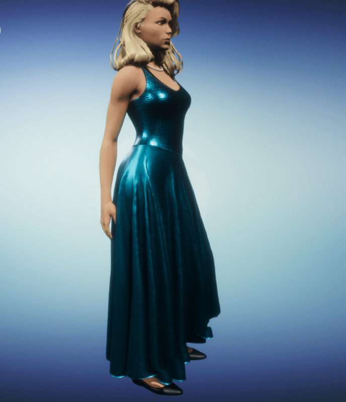 Long elegant halter-neck dress in shiny peacock blue lame and silk.