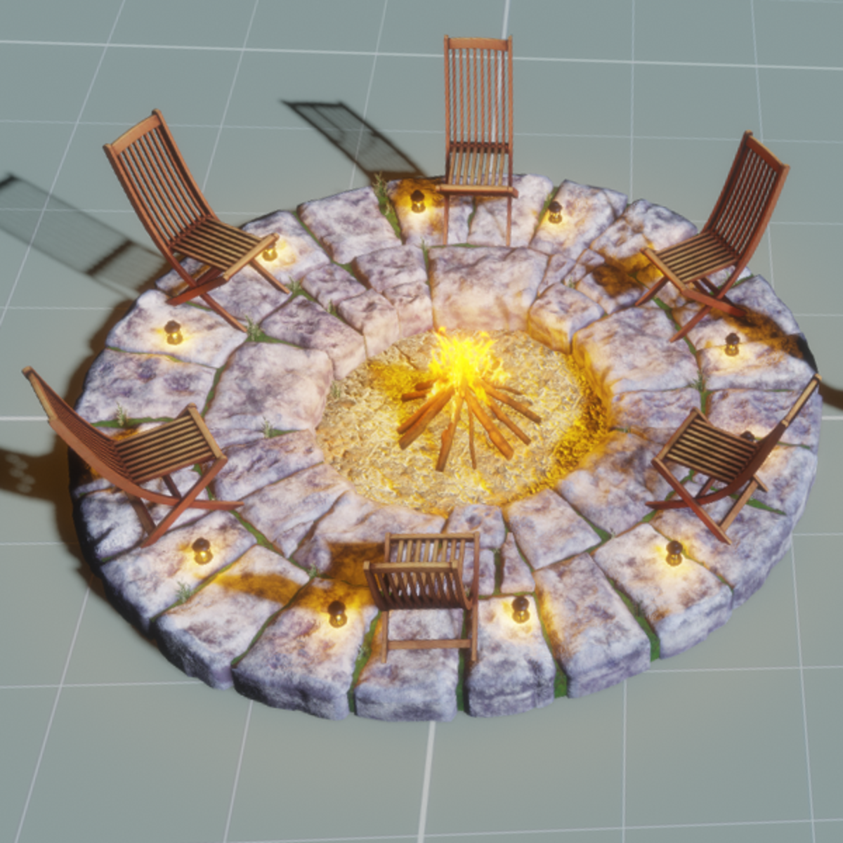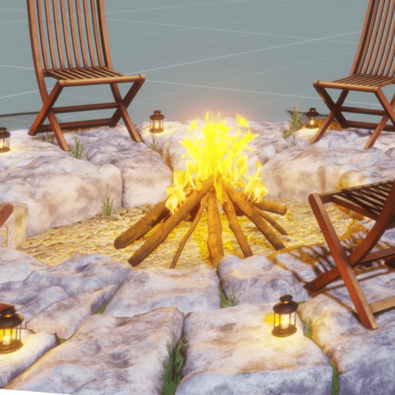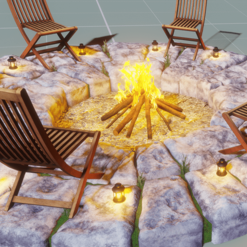 It's a campfire party scene, with real rocks, aweeds, chairs and candle lamps. Suitable for house in the yard, outdoors, and having fun with friends. WOW's store:https://store.sansar.com/store/wow