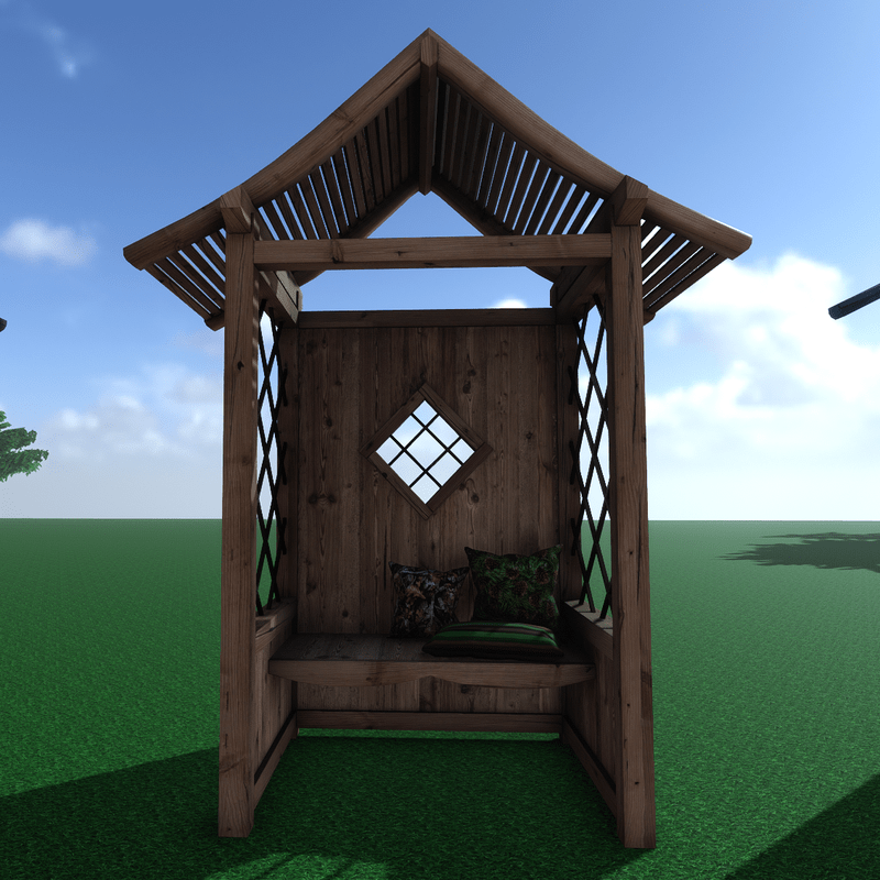 A wooden arbor in brown colour for the garden or the beach. It's decorated with printed cushions. Multi object item, it's editable and has collision. You can take a closer look here: https://atlas.sansar.com/experiences/luise/studio-lamda