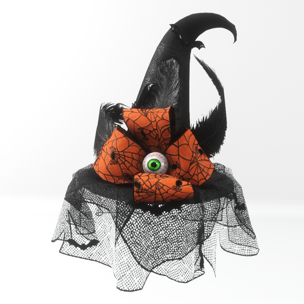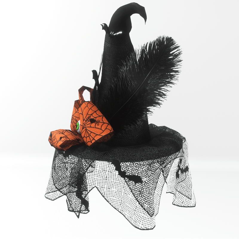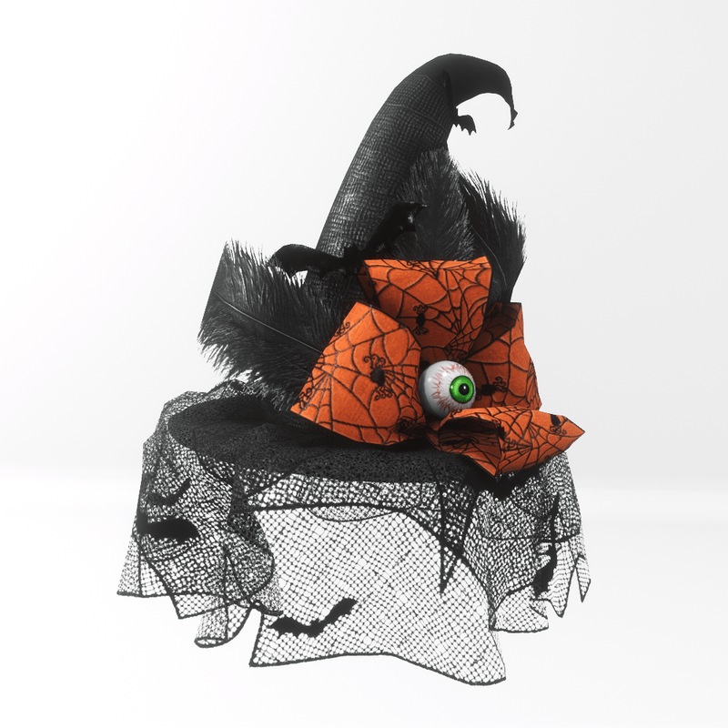 A beautiful witch hat, ideal for the Halloween and any costume party. Is decorated with a net veil with small bats, black feathers, a big orange bow with small spider pattern, a creepy eyeball and black bats. It's worn as glasses.