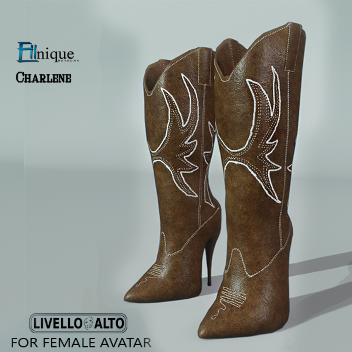 Charlene-Cowgirl Boots, Brown -for LIVELLO ALTO Female Avatar See all avatars by Livello Alto & Co. @ Alfy's Store -https://store.sansar.com/store/Alfy