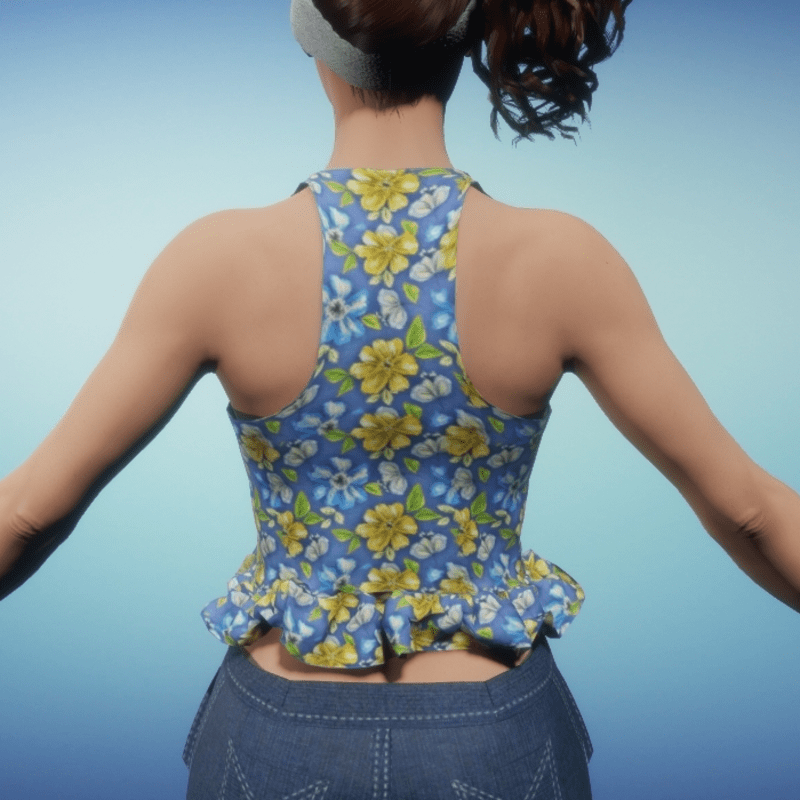 Three button cotton print crop top with racer back and ruffle at waistline. For best results wear the top without hair when simulating cloth. After you have finished the simulate process add your hairstyle.