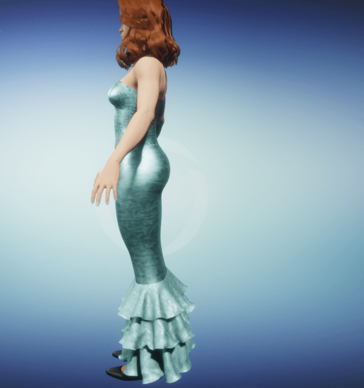 Classic mermaid dress as introduced in the 1940's. Skin-hugging strapless satin sheath dress with frilly layers at the lower edge. In ice blue.