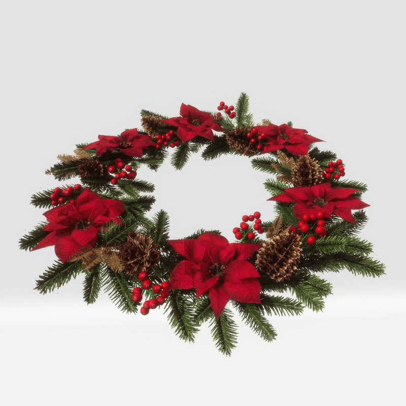 A Christmas wreath made with fir, poinsettias, ferns, pine cones and winter berries. Suitable for interior and exterior decorations. No collision. You can see it here: https://atlas.sansar.com/experiences/luise/terra-di-luci