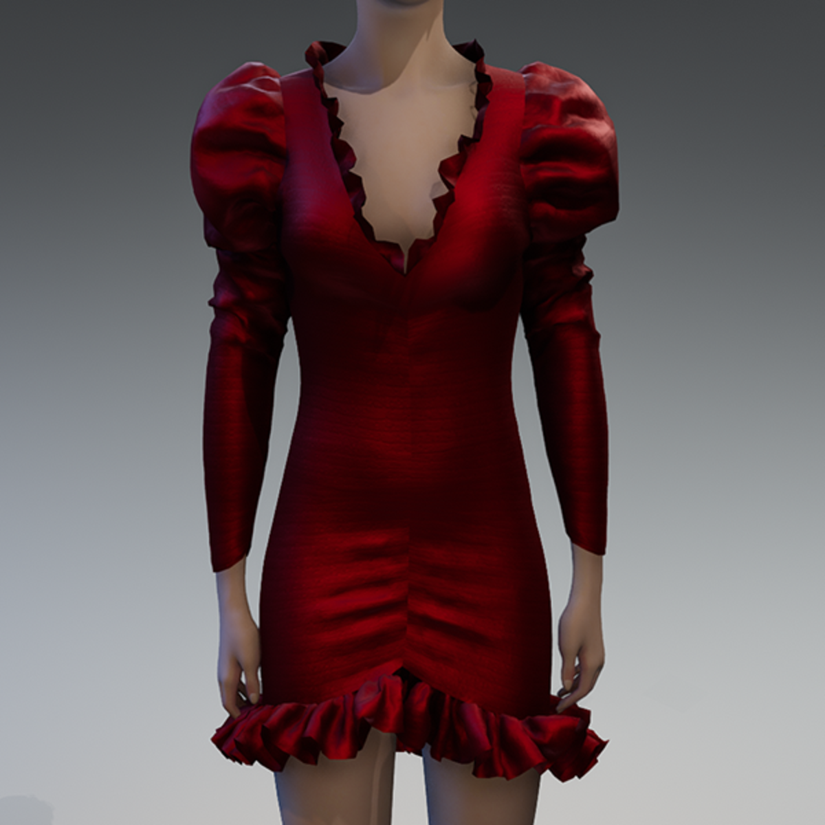 Red textured silk ruched puff sleeve dress