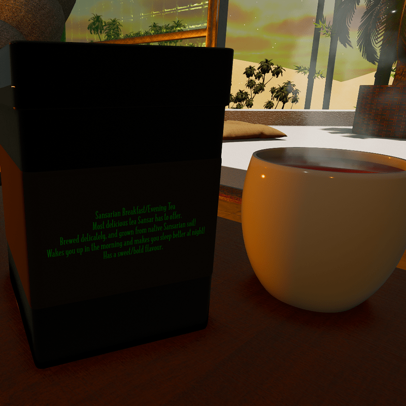 Sansarian Breakfast/Evening Tea Most delicious tea Sansar has to offer. Brewed delicately, and grown from native Sansarian soil! Wakes you up in the morning and makes you sleep better at night! Has a sweet/bold flavour. Try Tea Villa Co. teas today! Coming out with more flavours later. Has normal maps, roughness maps and also is dynamic and has a metal sound when you throw it.