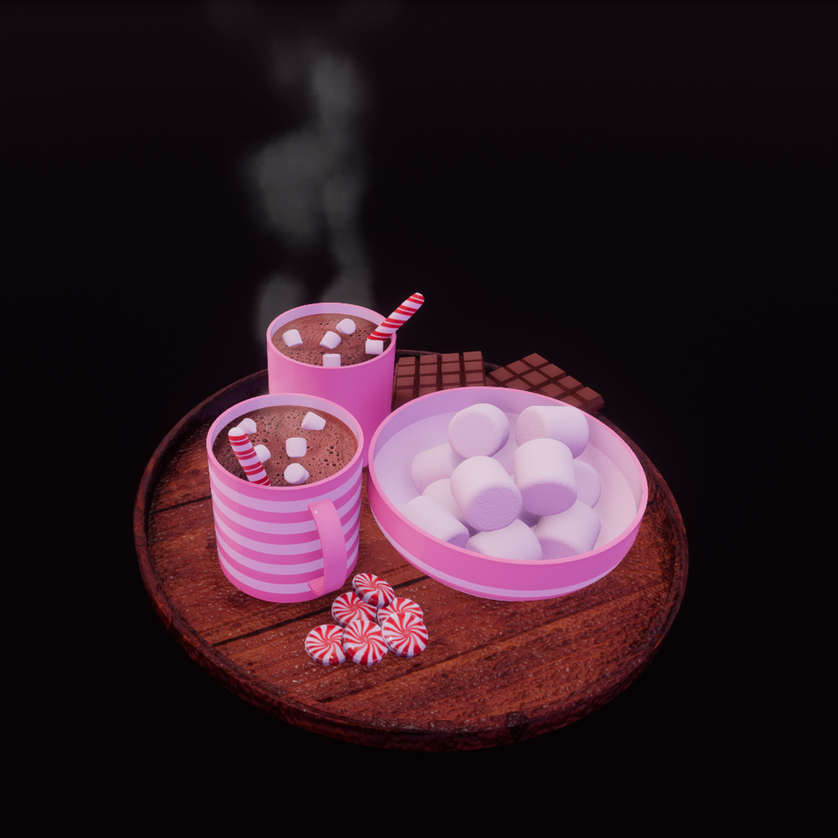 Cute tray of hot cocoa. Looks ultra realistic. Has normal maps. Included in this photo. Has animated steam. x2 mugs of hot cocoa. x1 bowl of marshmallows x2 peppermint stirring sticks x6 peppermint candies x3 chocolate bars x1 wooden tray x2 animated steams
