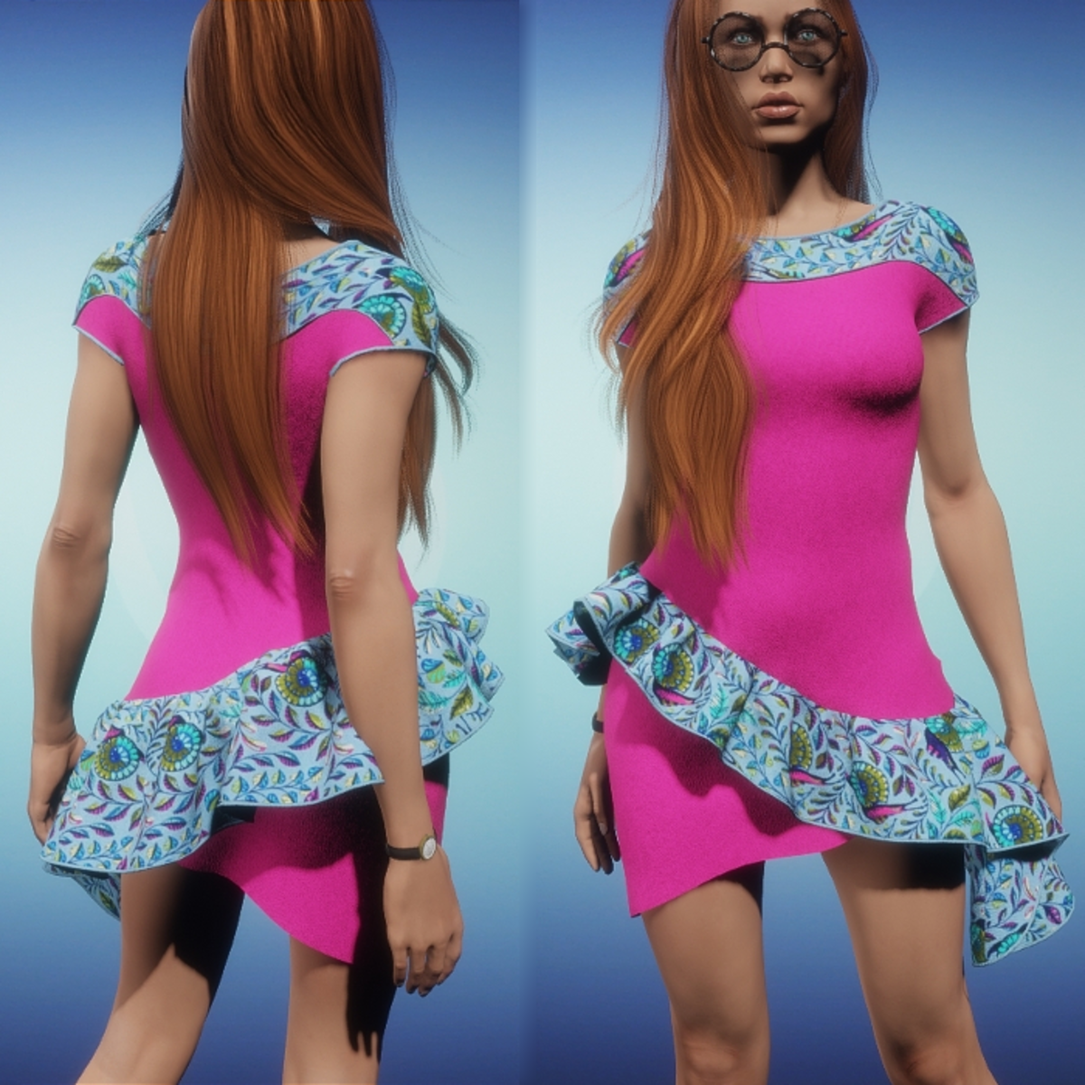 A simple yet flirty dress for your hot summer months. Please be sure to hit the adjust button in the lookbook when wearing any clothing made in Marvelous Designer. This much improves the fit as well as gives you the chance to push the fabric around to your liking. Use the Worn Items Menu in the lookbook to adjust individual pieces of MD clothing. Push the little button with the triangle to adjust one item at a time or use the big button at the top of the screen to adjust all pieces of MD clothing at the same time. It is advised to not wear hair until you have completed all MD clothing adjustments.