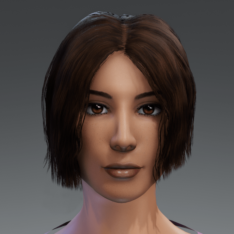 Bella is a young, beautiful darker tan custom avatar with charming freckles and blue/green eyes. Her make-up is natural, but for the amazing lip gloss she uses. Hair/Clothes NOT included! Shape was created with the FULLSpectrum Avatar Kit 2.0. Has dark red nails by default (no extra item needed). Textured in Substance Painter entirely fresh, not based on any default texture. The main product shot with the brown eyes uses Cora's free eye replacement/overlay. FullSpectrum Avatars, use 2k textures for face and body and a 1k texture for the eyes and lashes. This makes them 3x faster loading compared to 2x4k+2k textures.