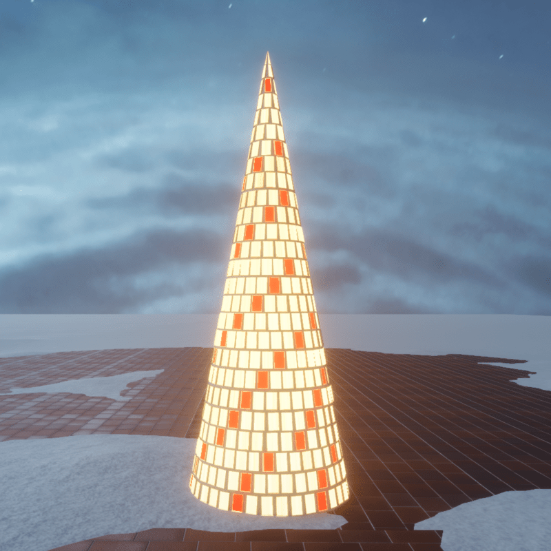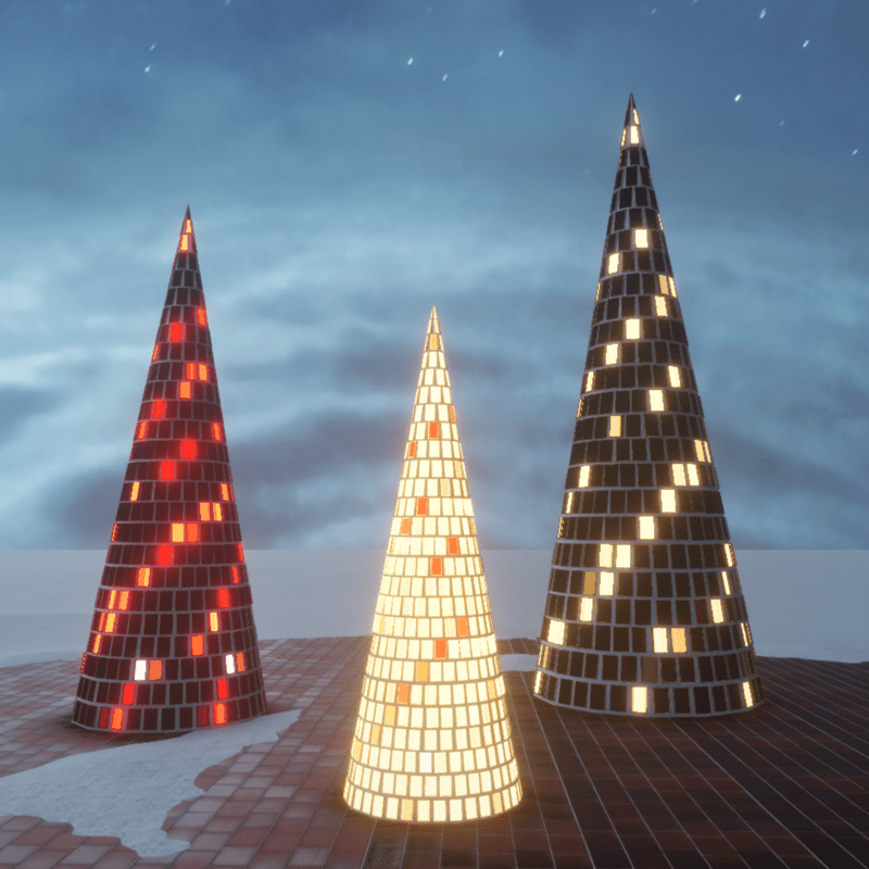 A disco style christmas cone in golden and red colour with running lights. With collision. You can check it here: https://atlas.sansar.com/experiences/luise/terra-di-luci