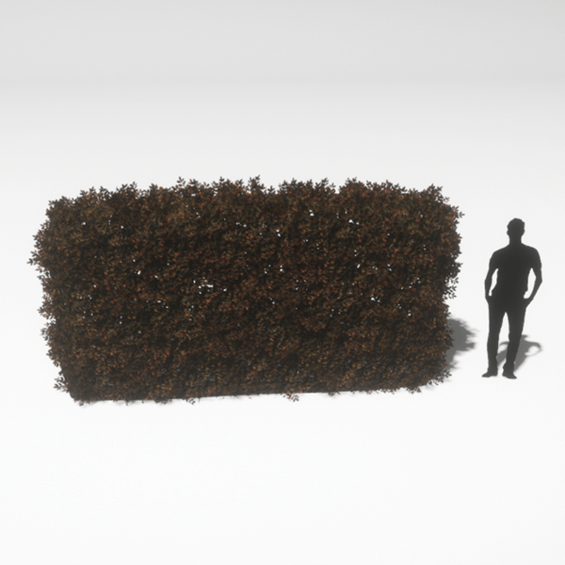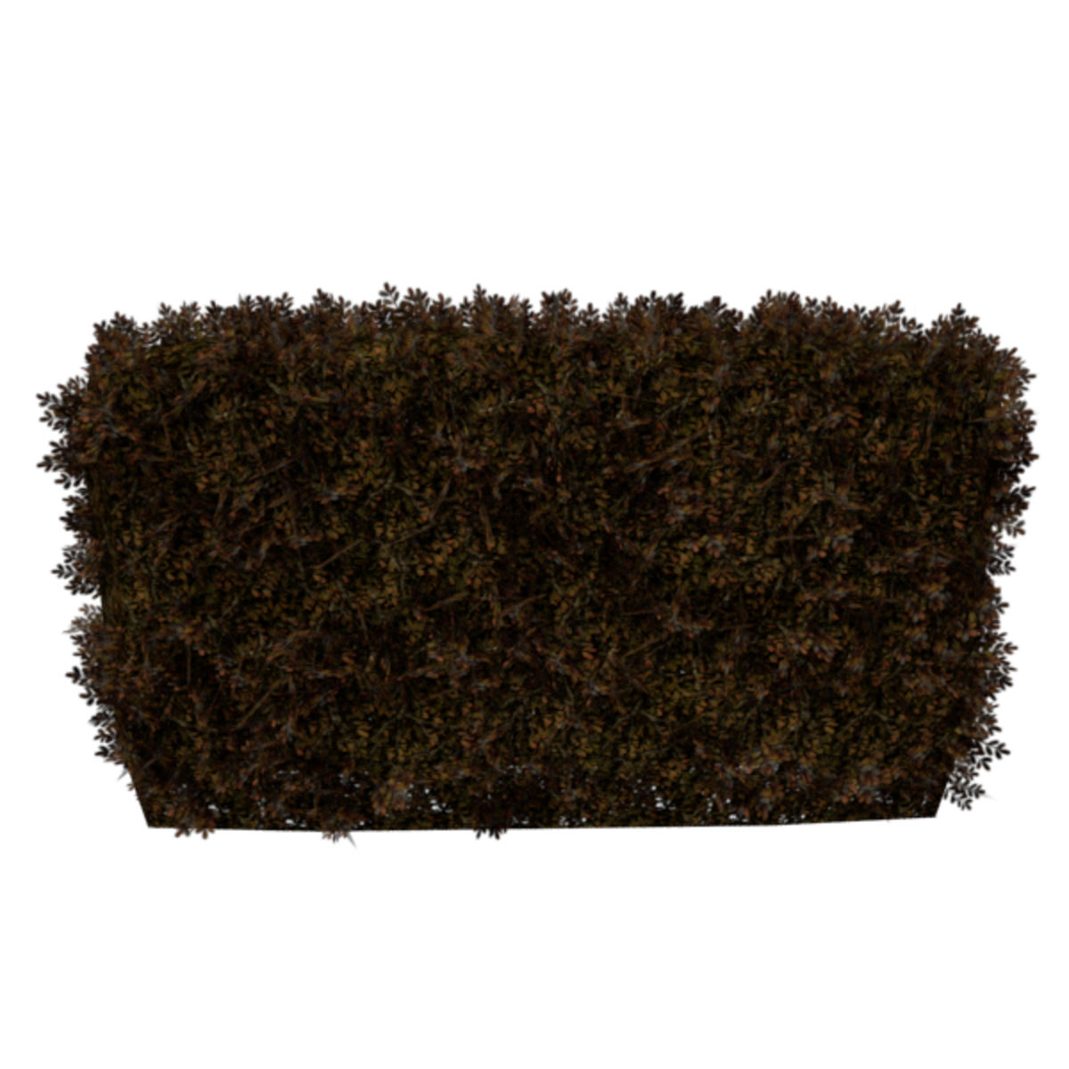 A straight English Boxwood hedge section with dry brown leaves and sticks. Opacity mapped textures are used for base and leaves. Approximately 4m wide, 1m deep and 3m tall. 3156 triangles.