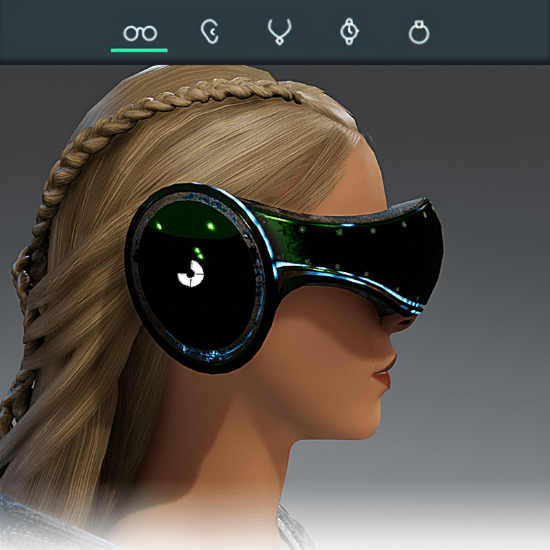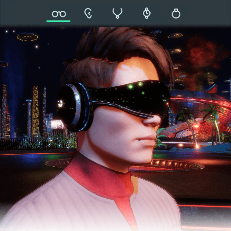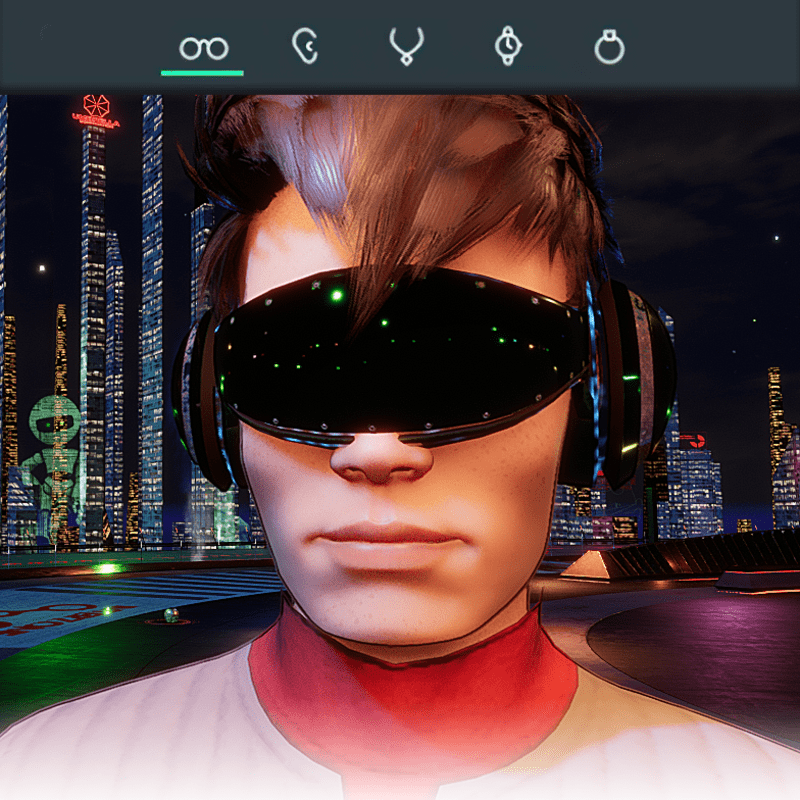 Visionary Design for a VR Headset exclusive for the Sansar Metaverse. These Vr Glasses do not mess up your avatar's hair. Minimal and Elegant Design. Vr glasses with headphones. Chrome Texture. Animated lights Inside. Unisex. Matches with all humanoid avatars. No need for adjustments for the default 2.0 Avatar of Sansar.