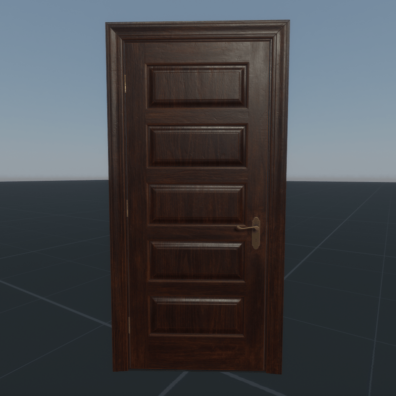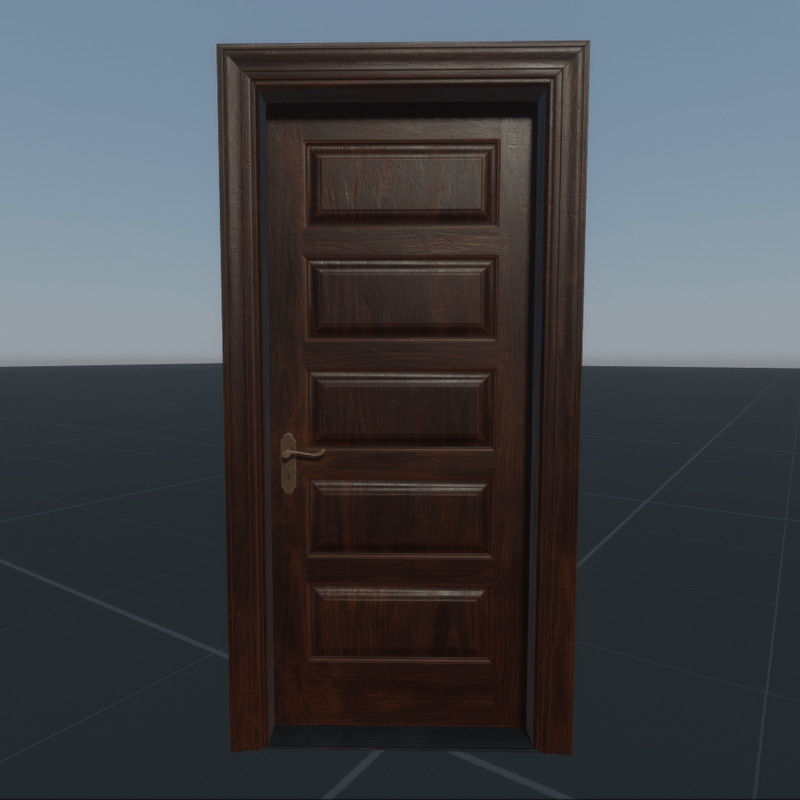 Five-panel single interior door with threshold (removeable). Almost new. Designed for office but can be used in home. Left hand (if out-swing). Please also check for right hand version of this door in the store. NOTE! Use "Scene objects" to add the collisions ("volume") and/or the scripts. NOTE! It is a 3-parts object: frame, slab and threshold NOTE! The script is currently under development. Features: - Almost real life dimensions (but slightly adjusted for usability) - For resale (in future) - Free updates Tech specs: - Wall opening size: 0.96 m width & 2.16 m height - Wall thickness: 0.16 m (+/- 0.02 m) - Recommended skirting thickness: 0.018 m (if the wall thickness is 0.16 m) - 1x 2048x2048 PBR texture set (same instance as DPSC16R) - Wood texel density: ~800 per meter - Collision: None (will be added when possible with multipart objects) - Triangles: 2587 - LODs: Will be added when possible keywords: used, hinge, hinged, pivot, pivoted, mahogany, brown, dark