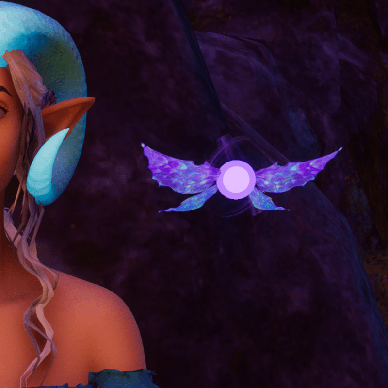 Animated glowing purple pixie pet; Worn in the Glasses Slot Animated wings and magic particles, see example gif: https://gyazo.com/befd6090d6c3656ecea6cabd95515a24 Wearable with other slot variants and FULLY TRANSFORMABLE! Textures hand drawn by NovaVoidSpirit