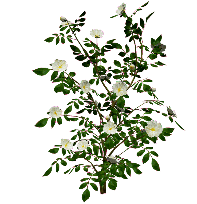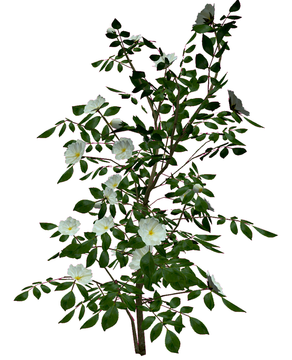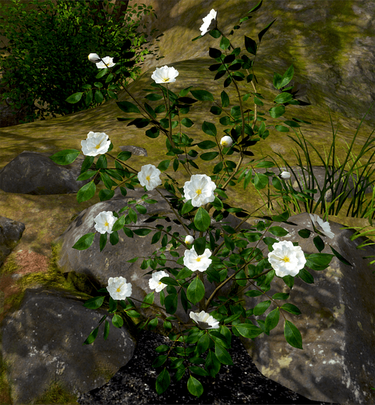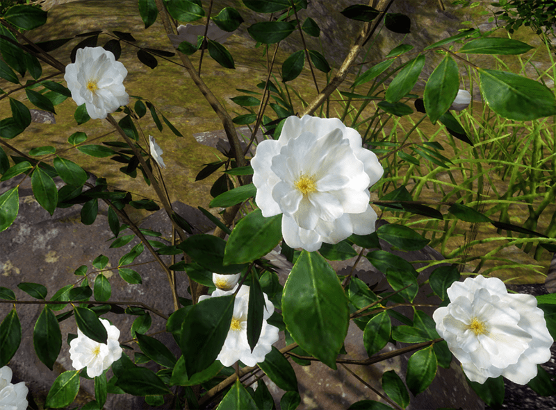 A camellia bush with white flowers. Flowers and leaves are alpha images on planes attached to solid stems. 3141 triangles. See in Sansar experience - https://atlas.sansar.com/experiences/reidparkin/reid-s-plants