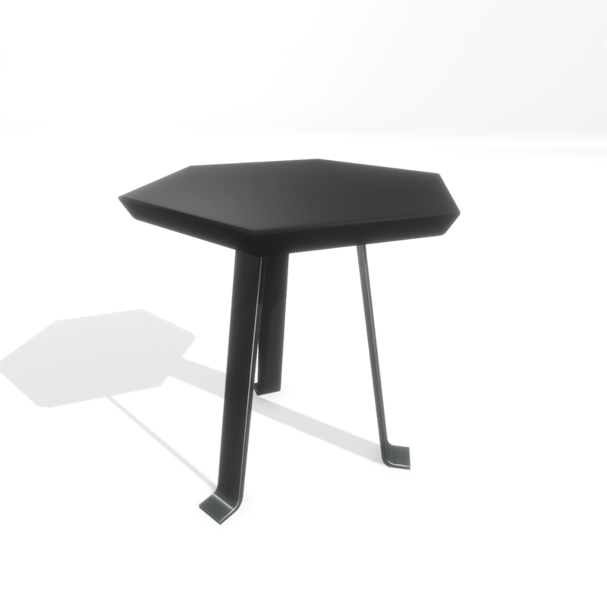 A tripod modern side table in hexagon shape, made of black stone and metal. It's part of the aegean set. With collision. Take a closer look here: https://atlas.sansar.com/experiences/luise/studio-lamda