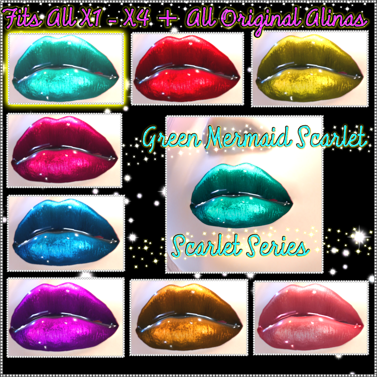 FREE for X1 - X4. Green Mermaid Scarlet Lips - Scarlet Series - Fits all Original Alina & X1 - X4 Avatars. It falls on top of the avatar lips and moves as you speak as well. These lips will cover the entire mouth area and is perfect for the Original Alinas. X1 - X4 will have the closed mouth look of the Original Alinas. For the X1 - X4 is free, contact me ingame and I will send you a link. Enjoy! :) NOTE: In your Lookbook will be under clothing.