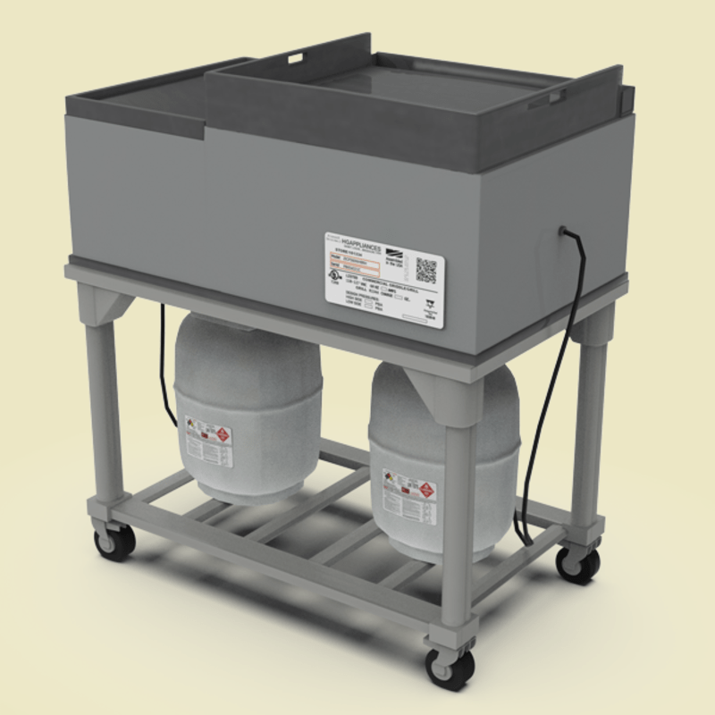A portable griddle for kitchen and restaurant decor. Griddle comes connected with two propane tanks.