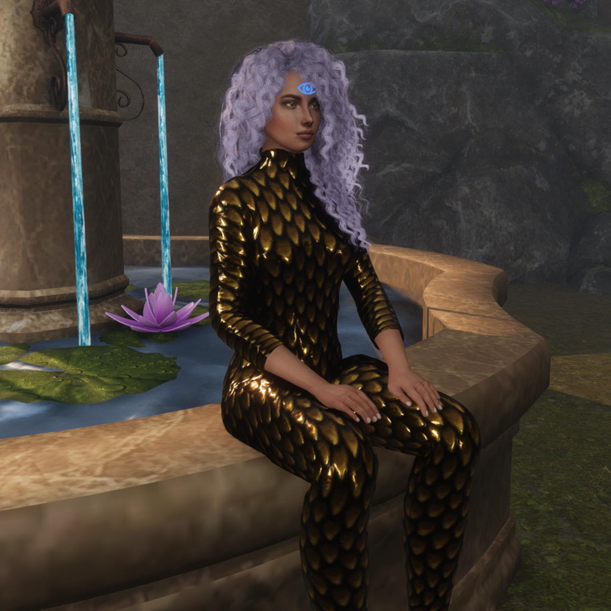 Dragon scale jumpsuit in gold. Tested on Alina avatar by Cora. Created in Marvelous Designer so you can adjust to your needs.