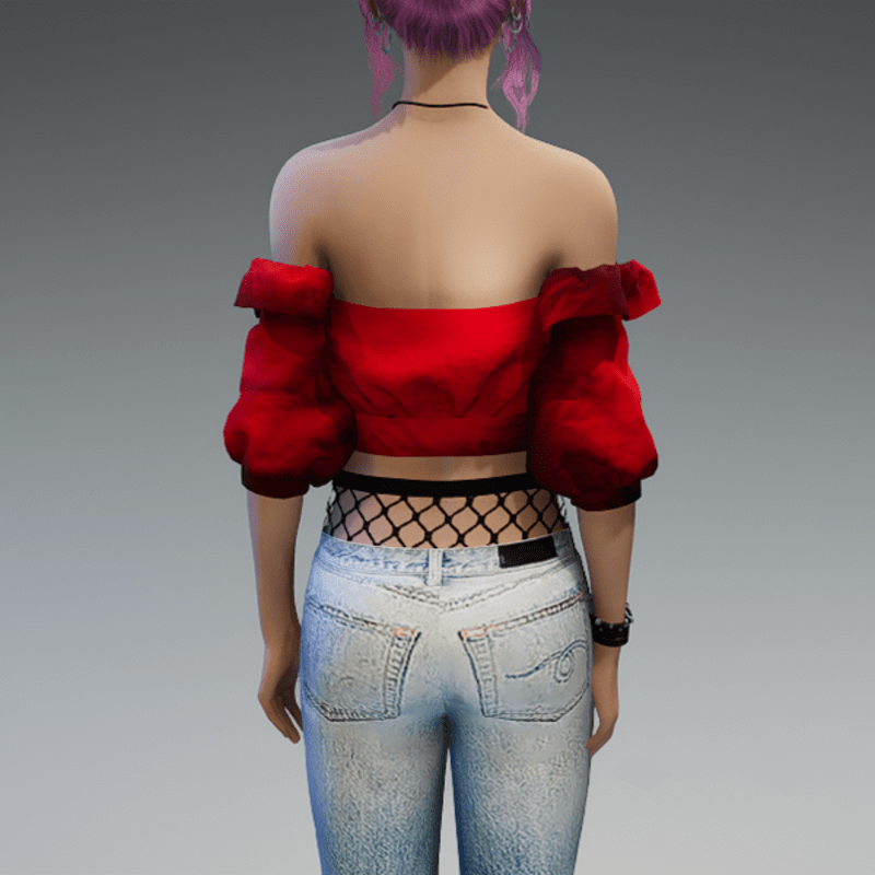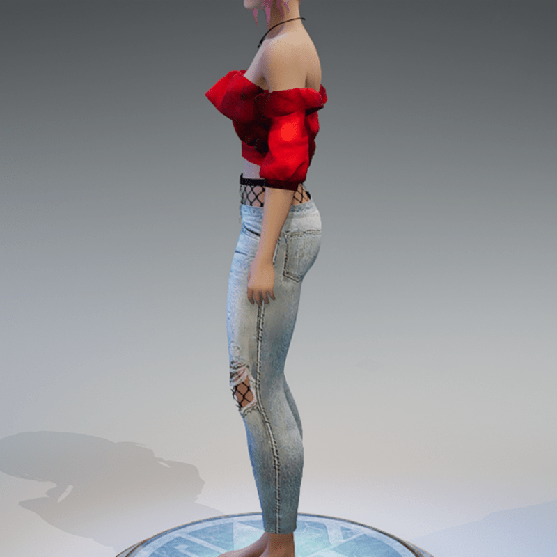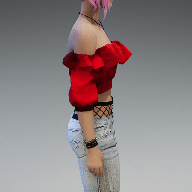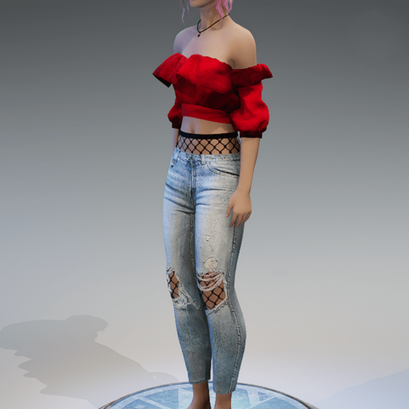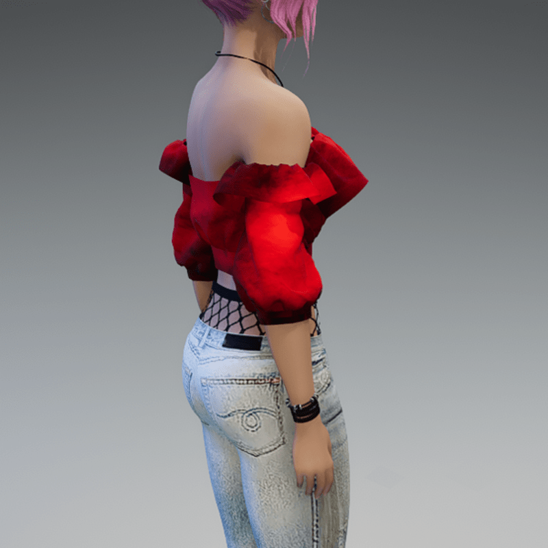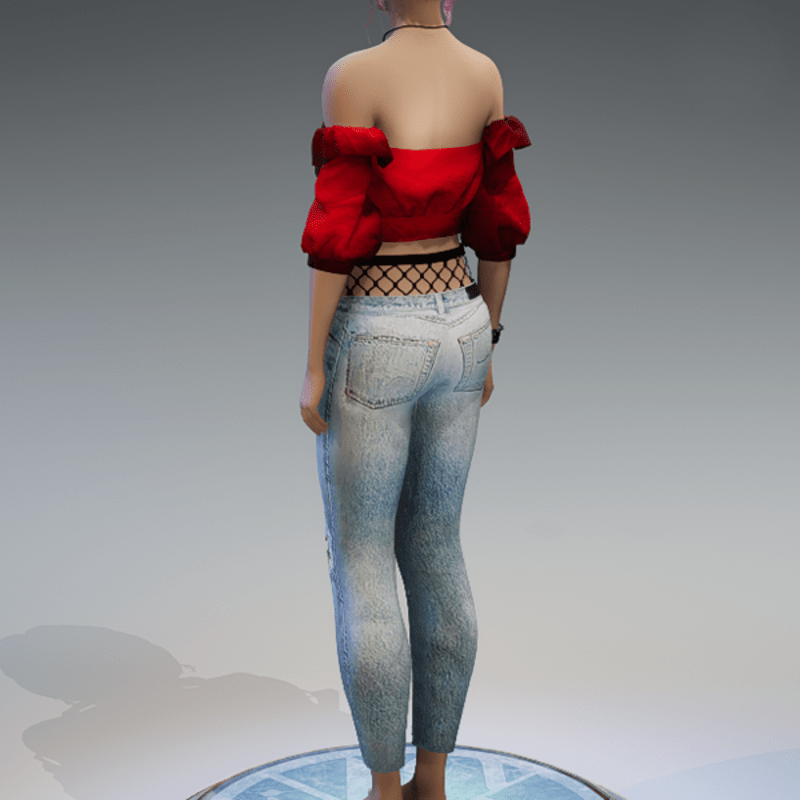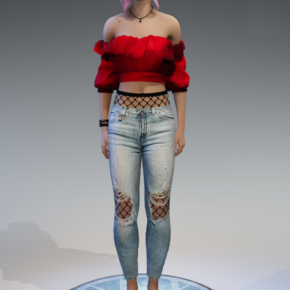 A full outfit, including the denim pants with some fishnet-applications on the knees and the top of the pants, as well as the 'flutter' shoulderfree top in red! If you're not sure about how this outfit will look like on your avatar, please use my free 'siggys store' version first before buying this one! Enjoy!