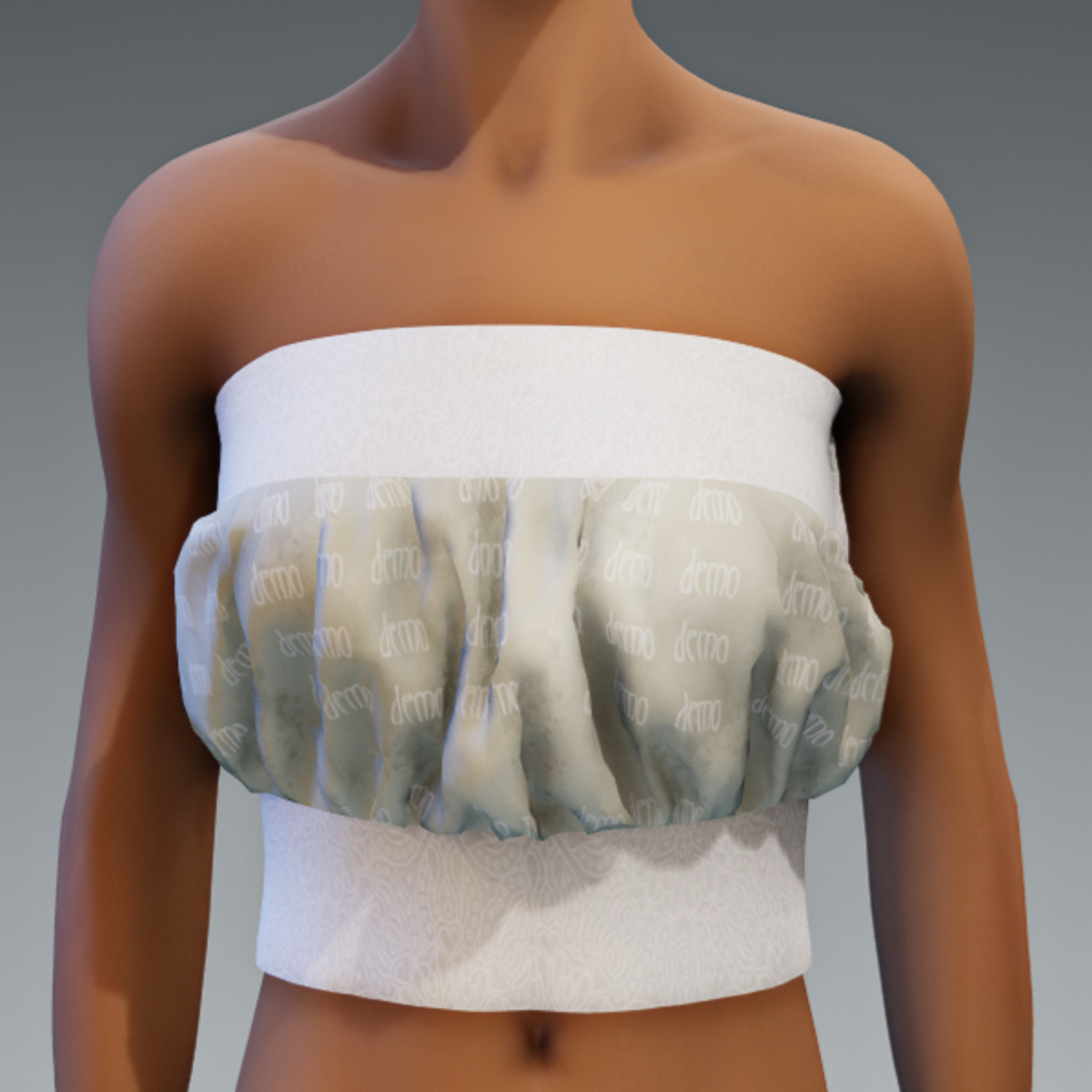 Wide banded bustier top in subtle prints, patterns and plain white. Fits Avatar 2.0 Try the DEMO.