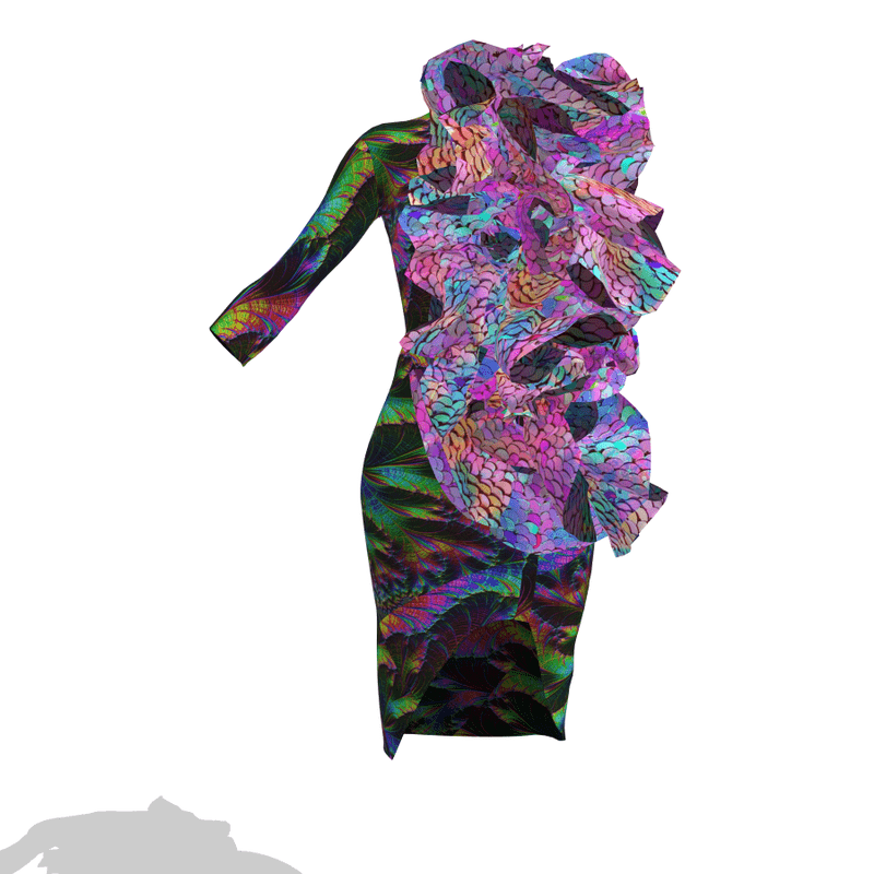 A psychedelic dress for the quirky and fun girl Notice: Please use the "Transform item" option to move, scale/rotate the clothing to fit your avatars body perfectly before adjusting. Adjust Clothing as much as you can to get it to look as pictured.