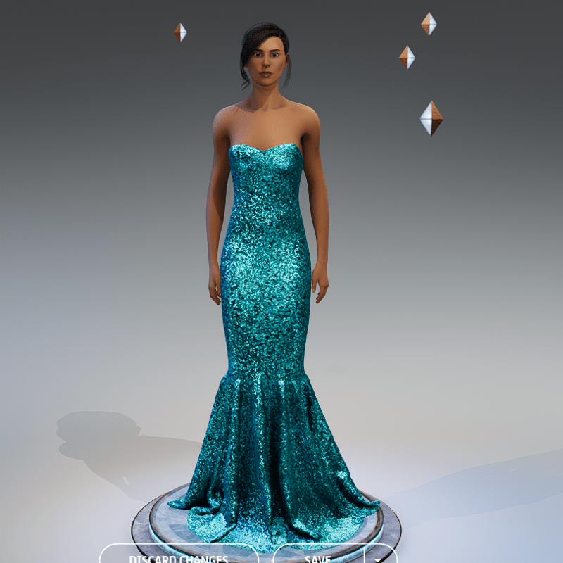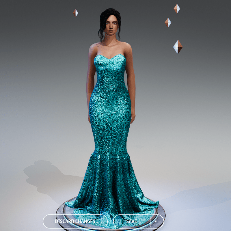 Mermaid Dress aqua, fitting all avatars. For Default Avatar you need just a quick clothing adjust. For Alina and more curvy avatars transform item a bit bigger in scale, then simulate clothing and stretch the dress from stomach upward.