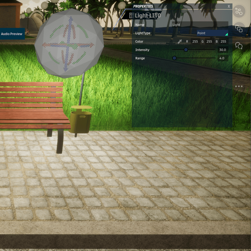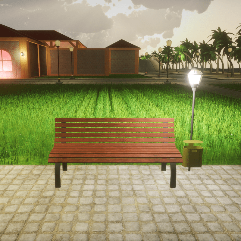 Beautiful bench with lantern with emissive map. For optimal lighting add a point light with intensity 30.0 and range 4.0(see 3rd picture). Feel free to view the lantern inworld at https://atlas.sansar.com/experiences/nobby/foxis-island