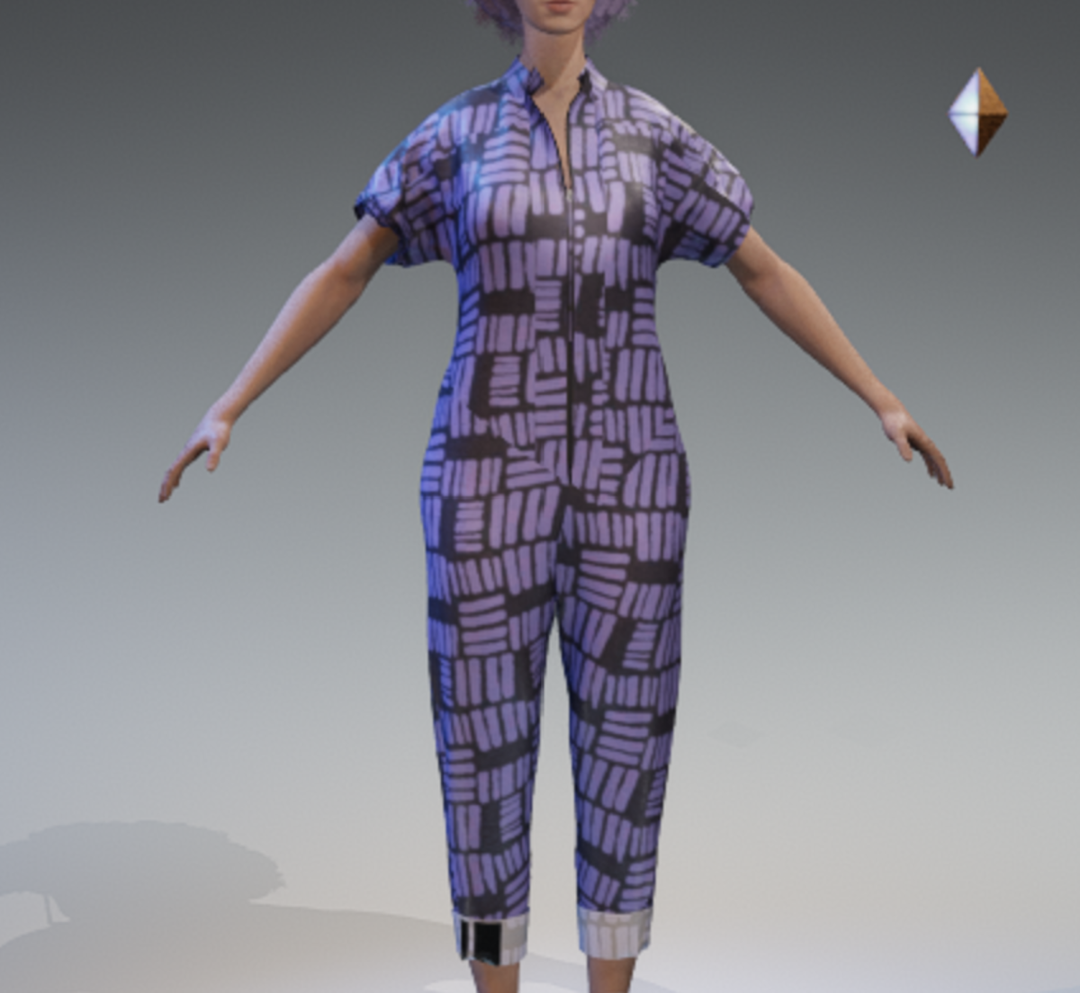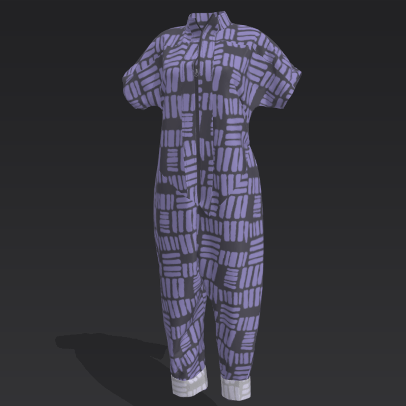 Zipper front jumpsuit with allover print in shades of dusty purples. Rolled cuff at bottom hem.