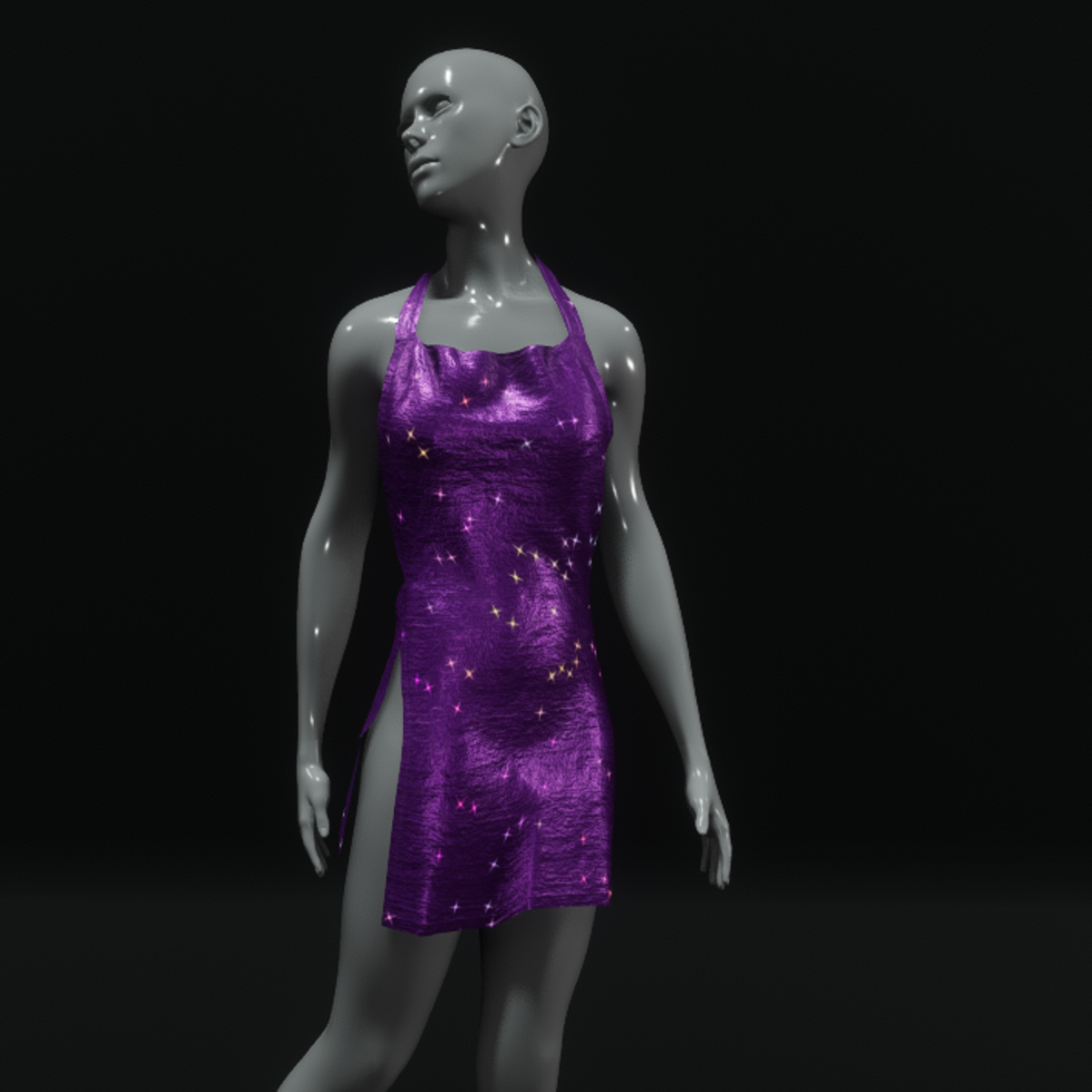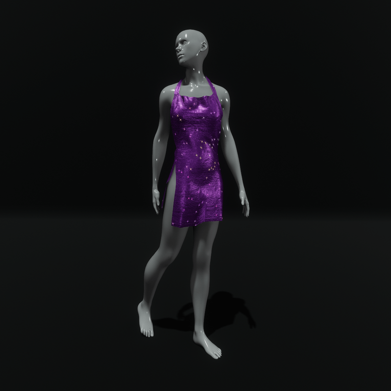 A small, sexy, glossy halter dress in purple color with sparkling effect. It has an open back and high openings on both sides. Get the demo item before purchasing to check style and fitting, here:https://store.sansar.com/listings/9a75c063-3ecd-4402-a5d8-daf72c599ed8/small-sparkling-club-dress---demo