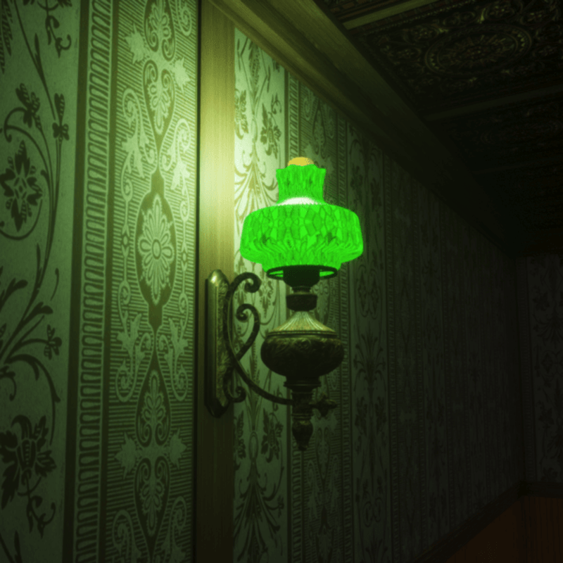 Antique oil wall lamp with emissive green glass. great fixture for historical type structures..includes built-in light, adjust if needed.