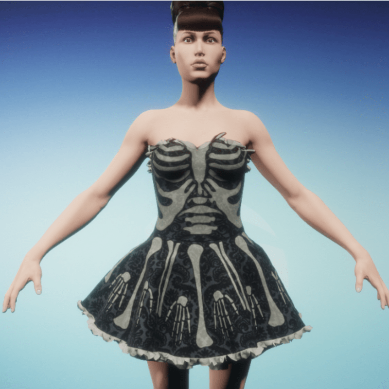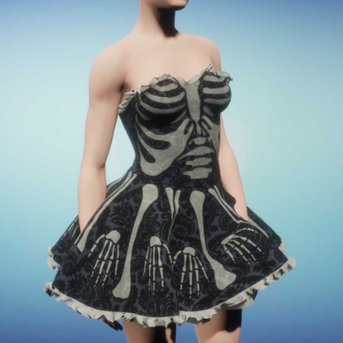Here's a dark number with a Damask base, superimposed by an arrangement of bones, all draped over a crinoline for fullness! Notes and Credits: -In desktop mode, hands will enter skirt, as shown in main photo. It's not terrible, and one day with cloth physics in world, this will not be a problem. However, in VR mode, you can put your hands where you like, and chair resting hands will actually look natural. -Lace texture under dress is adapted from an image by kjpargeter SEO: dress goth gothic black skeleton halloween voodoo clothes women female