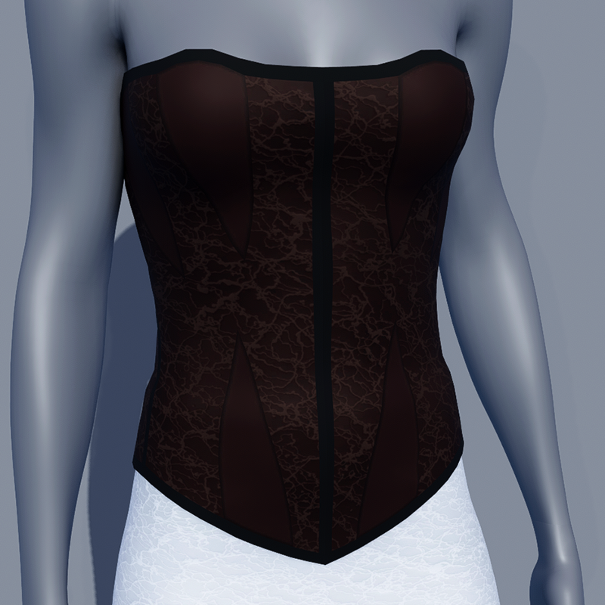 This is a leather corset. As I made it with Marvelous Designer, you can adjust it to your avatar. It is available in 16 different colors at my store. You can also find leather skirt that match colors in my store. Find all my leather clothing here: https://store.sansar.com/store/MorganeParis?category=clothing&q=Leather&sort=created You can see them in Sansar here: https://atlas.sansar.com/experiences/morganeparis/mpp-mainstore