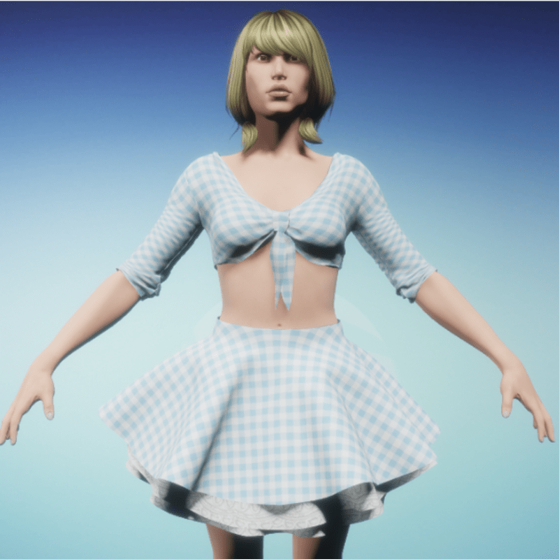 Fresh, bouyant, and cute in light blue gingham. Notes and Credits: -In desktop mode, hands will enter skirt, as shown in main photo. It's not terrible, and one day with cloth physics in world, this will not be a problem. However, in VR mode, you can put your hands where you like, and chair resting hands will actually look natural. -Hair in product photos is by Cora. You can buy the hair here: https://store.sansar.com/listings/4df689eb-f04f-4720-a36e-d73972b2625b/short-pigtail-hair---meg -Lace texture under dress is adapted from an image by kjpargeter SEO: blue dress top skirt gingham country 50 60 70 1950 1960 1970 clothes women female