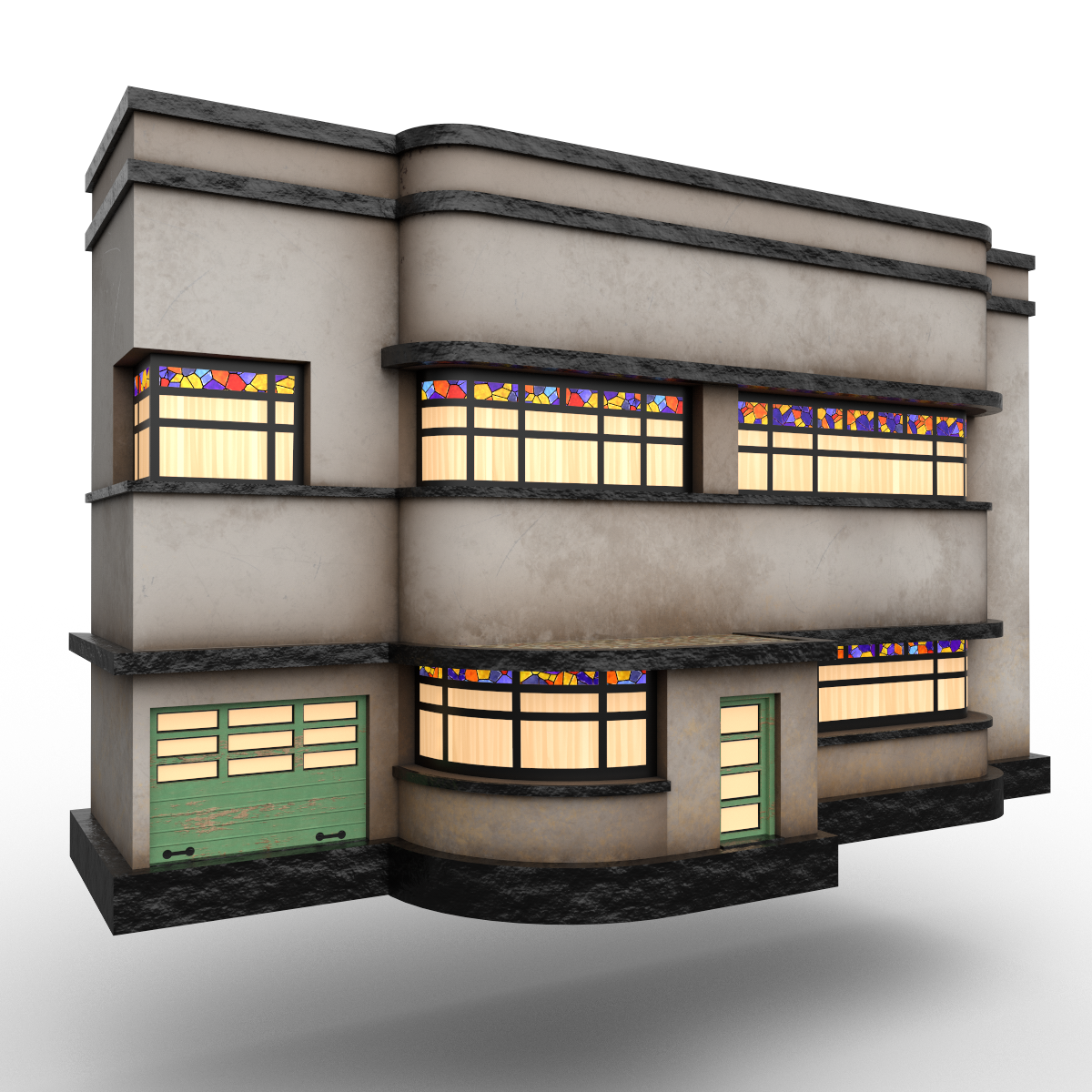 Art Deco prop to be used as background object to fill your scene. Note that is a prop and not a house you can enter! 2 objects (can be moved separately), mirrored houses as in a left and a right house. Emissive windows. Collision: Yes. (to make it more lively, you can add an audio volume to it with sound of ppl living there)