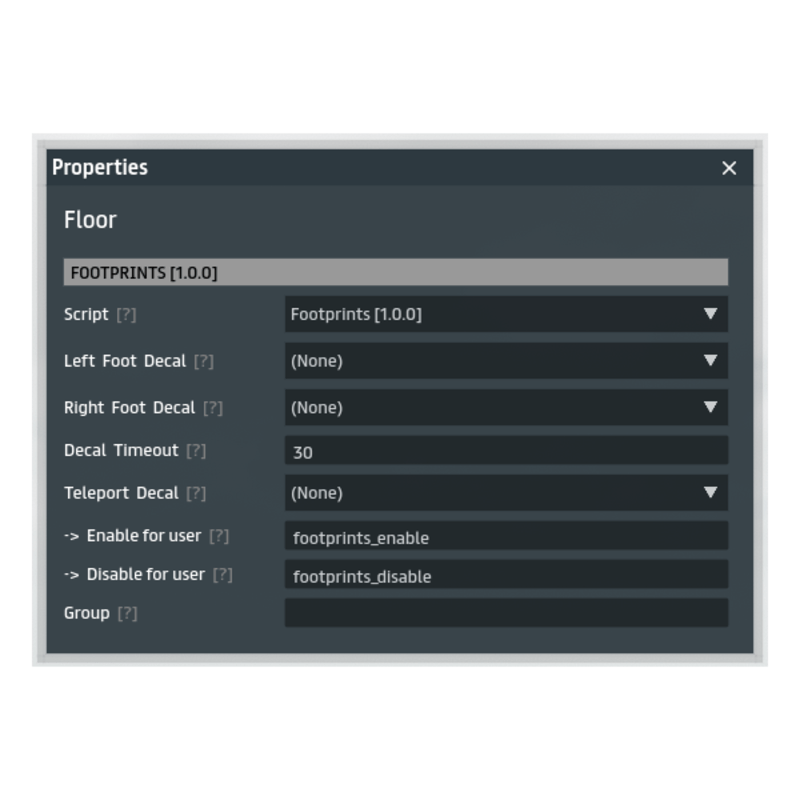 Rez custom footprint decals while walking/running. Needs to be activated per agent with a Script Library event. If you have multiple surfaces with different footprint decals, you will need to trigger enable/disable with a trigger volume or collision scripts. * I allow buyers to resell this script as part of their own products, but not as a standalone script